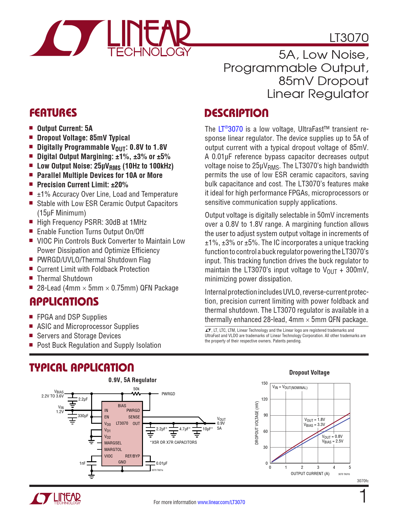 LT3070 5A, Low Noise, Programmable Output, 85mV Dropout Linear Regulator