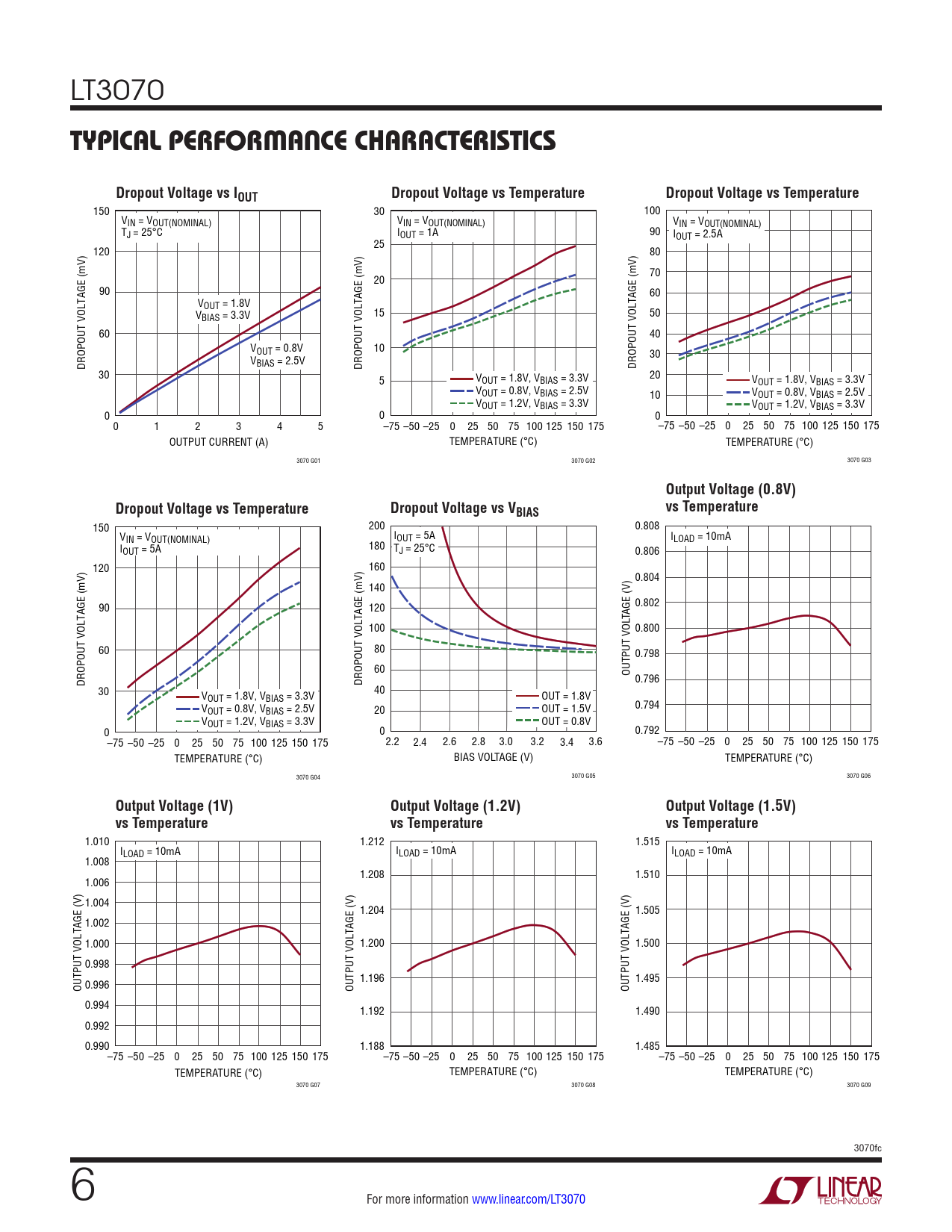 150 200 0.808 V I IN = VOUT(NOMINAL) OUT = 5A ILOAD = 10mA 180 I T OUT = 5A J = 25°C 0.806 120 160 0.804 140 0.802 90 120 TAGE (V) 100 0.800 60 80 0.798 60 OUTPUT VOL DROPOUT VOLTAGE (mV) DROPOUT VOLTAGE (mV) 0.796 30 40 VOUT = 1.8V, VBIAS = 3.3V OUT = 1.8V 0.794 VOUT = 0.8V, VBIAS = 2.5V 20 OUT = 1.5V VOUT = 1.2V, VBIAS = 3.3V OUT = 0.8V 0 0 0.792 –75 –50 –25 0 25 50 75 100 125 150 175 2.2 2.4 2.6 2.8 3.0 3.2 3.4 3.6 –75 –50 –25 0 25 50 75 100 125 150 175 TEMPERATURE (°C) BIAS VOLTAGE (V) TEMPERATURE (°C) 3070 G04 3070 G05 3070 G06