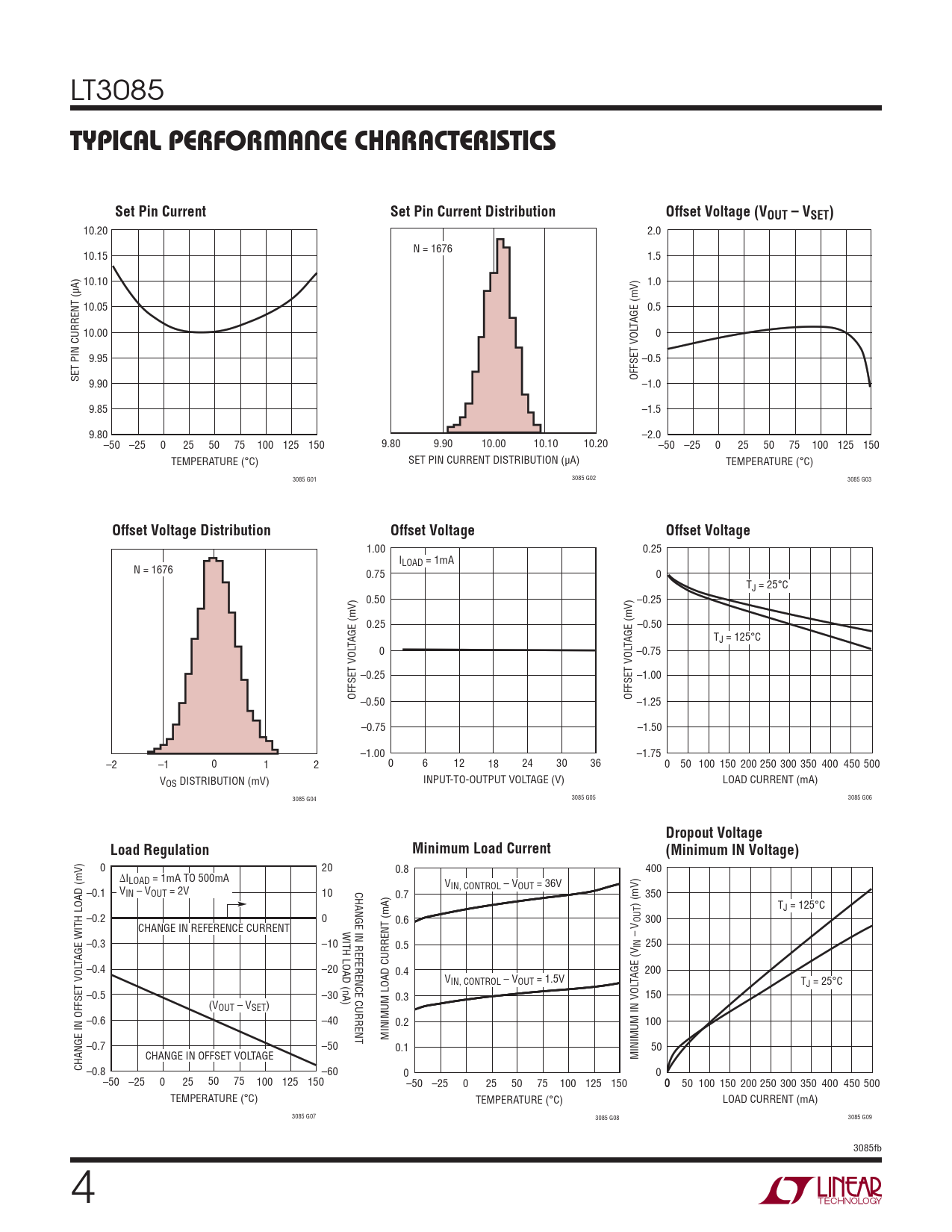 1.00 0.25 ILOAD = 1mA N = 1676 0.75 0 TJ = 25°C 0.50 –0.25 0.25 –0.50 T TAGE (mV) TAGE (mV) J = 125°C 0 –0.75 –0.25 –1.00 OFFSET VOL OFFSET VOL –0.50 –1.25 –0.75 –1.50 –1.00 –1.75 –2 –1 0 1 2 0 6 12 18 24 30 36 0 50 100 150 200 250 300 350 400 450 500 VOS DISTRIBUTION (mV) INPUT-TO-OUTPUT VOLTAGE (V) LOAD CURRENT (mA) 3085 G04 3085 G05 3085 G06