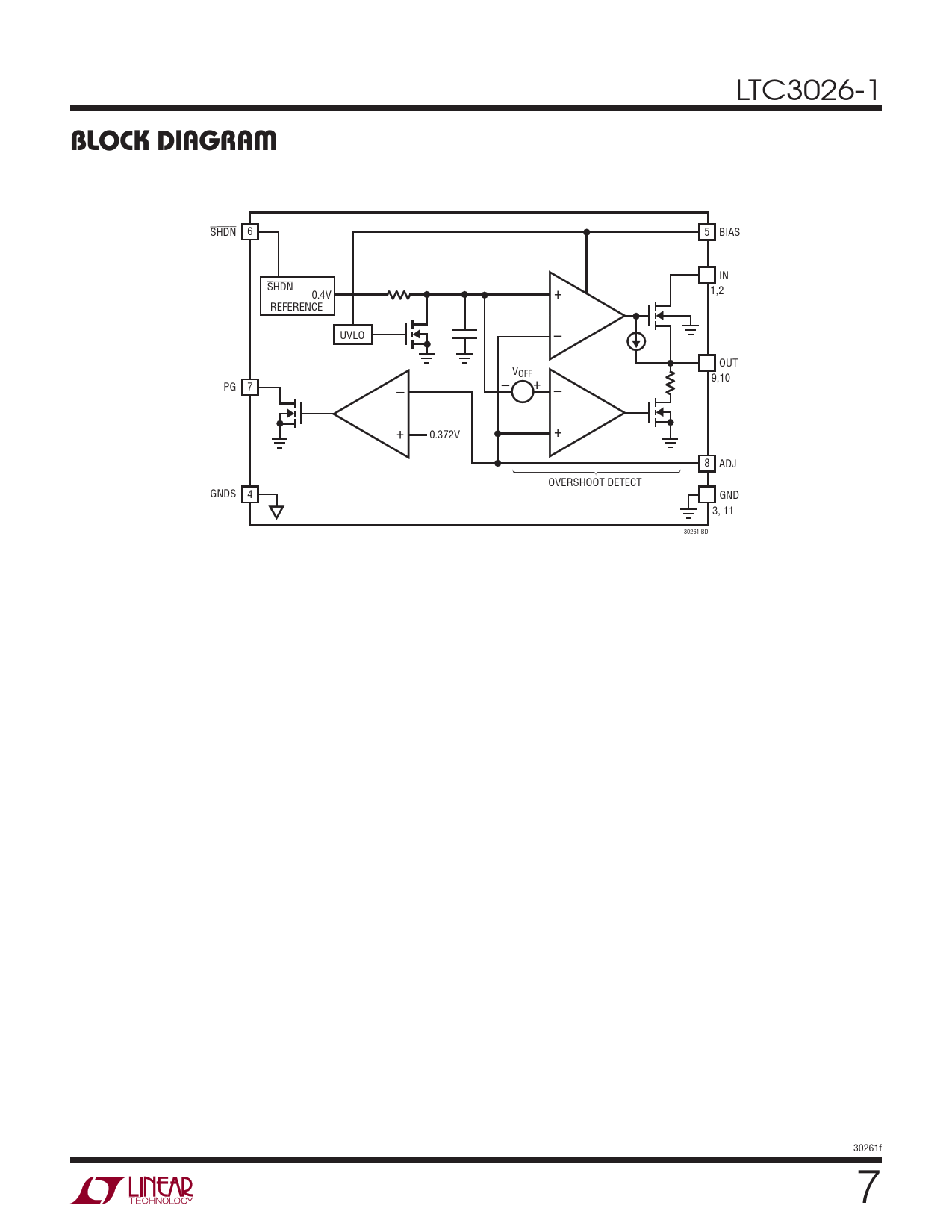 SHDN 6 5 BIAS IN SHDN 0.4V + 1,2 REFERENCE UVLO – OUT VOFF 9,10 PG 7 – – + – + 0.372V + 8 ADJ OVERSHOOT DETECT GNDS 4 GND 3, 11 30261 BD 30261f 7