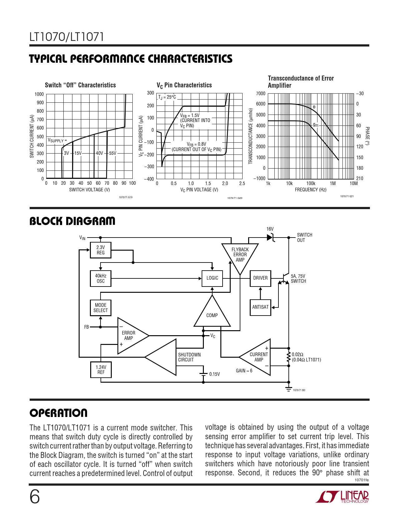 LT1070/LT1071 WUTYPICAL PERFORMANCE CHARACTERISTICSTransconductance of ErrorSwitch “Off” CharacteristicsVC Pin CharacteristicsAmplifier 1000 300 7000 – 30 TJ = 25°C 900 6000 200 θ 0 800 V 5000 30 µA) FB = 1.5V 700 100 µmho) µA) (CURRENT INTO V 4000 gm 60 PHASE ( 600 C PIN) 0 500 3000 90 VSUPPLY = ° –100 ) 400 VFB = 0.8V 2000 120 PIN CURRENT ( (CURRENT OUT OF VC PIN) 300 3V 15V 40V 55V C SWITCH CURRENT ( V – 200 1000 150 200 TRANSCONDUCTANCE ( – 300 0 180 100 0 – 400 –1000 210 0 10 20 30 40 50 60 70 80 90 100 0 0.5 1.0 1.5 2.0 2.5 1k 10k 100k 1M 10M SWITCH VOLTAGE (V) V FREQUENCY (Hz) C PIN VOLTAGE (V) 1070/71 G19 1070/71 G21 1070/71 G20 WBLOCK DIAGRAM 16V SWITCH VIN OUT 2.3V FLYBACK REG ERROR AMP 40kHz LOGIC DRIVER 5A, 75V OSC SWITCH MODE ANTISAT SELECT COMP – FB ERROR VC + AMP + SHUTDOWN CURRENT 0.02Ω CIRCUIT AMP (0.04Ω LT1071) 1.24V – GAIN ≈ 6 REF 0.15V 1070/71 BD UOPERATION The LT1070/LT1071 is a current mode switcher. This voltage is obtained by using the output of a voltage means that switch duty cycle is directly controlled by sensing error amplifier to set current trip level. This switch current rather than by output voltage. Referring to technique has several advantages. First, it has immediate the Block Diagram, the switch is turned “on” at the start response to input voltage variations, unlike ordinary of each oscillator cycle. It is turned “off” when switch switchers which have notoriously poor line transient current reaches a predetermined level. Control of output response. Second, it reduces the 90° phase shift at 10701fe 6