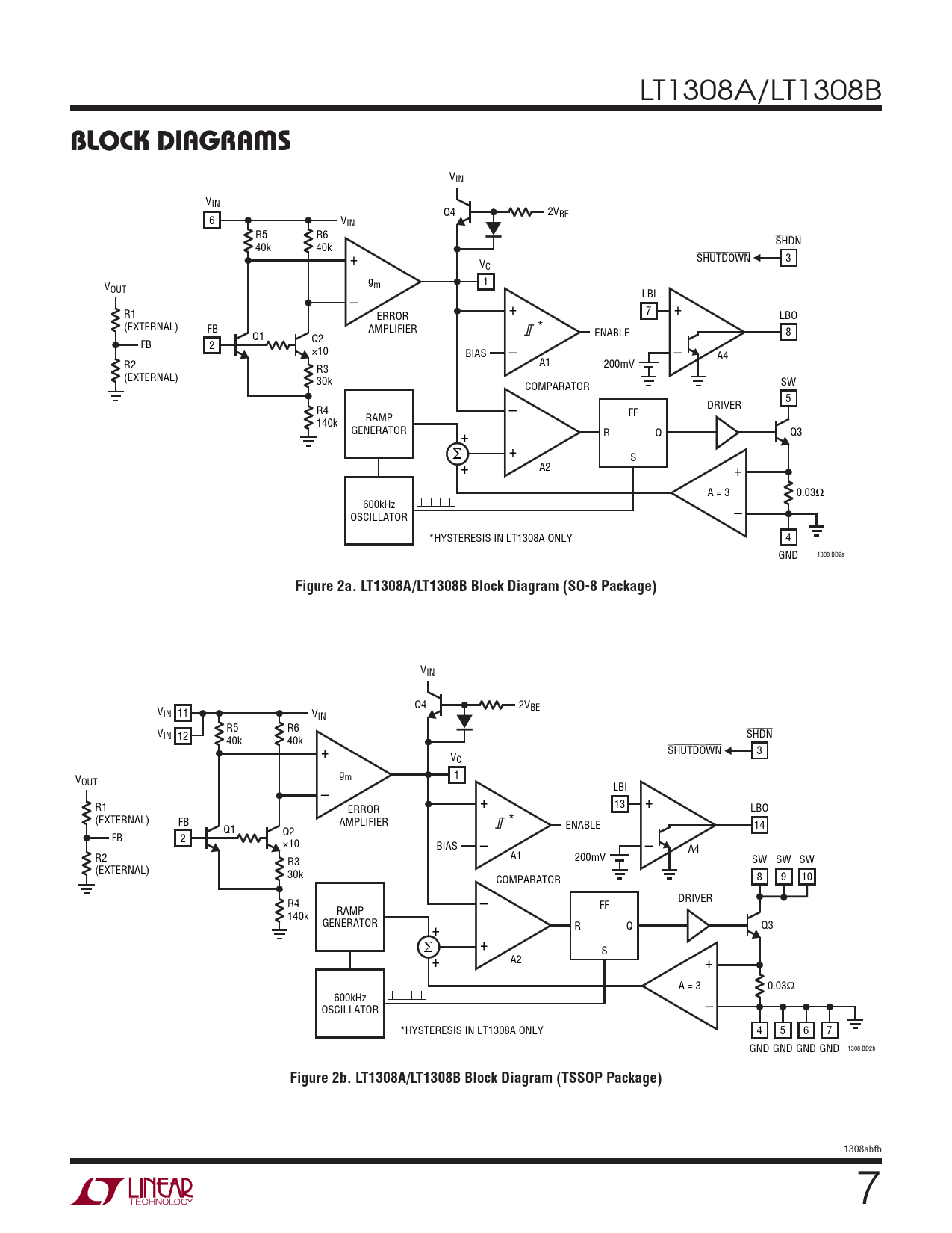 VIN Q4 2VBE VIN 11 VIN R5 R6 VIN 12 SHDN 40k 40k + SHUTDOWN 3 VC gm 1 VOUT LBI – R1 + 13 + ERROR LBO (EXTERNAL) FB AMPLIFIER * Q1 ENABLE 14 Q2 FB 2 ×10 BIAS – – A4 R2 A1 200mV SW SW SW R3 (EXTERNAL) 30k COMPARATOR 8 9 10 – DRIVER R4 FF RAMP 140k GENERATOR + R Q Q3 + Σ S + A2 + A = 3 0.03Ω 600kHz OSCILLATOR – *HYSTERESIS IN LT1308A ONLY 4 5 6 7 GND 1308 BD2b GND GND GND