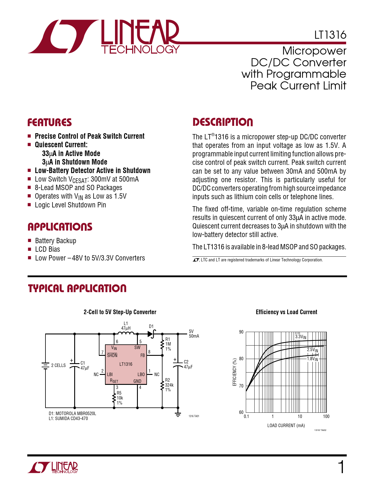 LT1316 Micropower DC/DC Converter with Programmable Peak Current Limit UFEATURESDESCRIPTION ■ Precise Control of Peak Switch Current The LT®1316 is a micropower step-up DC/DC converter ■ Quiescent Current: that operates from an input voltage as low as 1.5V. A 33 µ A in Active Mode programmable input current limiting function allows pre- 3 µ A in Shutdown Mode cise control of peak switch current. Peak switch current ■ Low-Battery Detector Active in Shutdown can be set to any value between 30mA and 500mA by ■ Low Switch VCESAT: 300mV at 500mA adjusting one resistor. This is particularly useful for ■ 8-Lead MSOP and SO Packages DC/DC converters operating from high source impedance ■ Operates with VIN as Low as 1.5V inputs such as lithium coin cells or telephone lines. ■ Logic Level Shutdown Pin The fixed off-time, variable on-time regulation scheme results in quiescent current of only 33µA in active mode. U Quiescent current decreases to 3µA in shutdown with the APPLICATIONS low-battery detector still active. ■ Battery Backup ■ The LT1316 is available in 8-lead MSOP and SO packages. LCD Bias ■ Low Power – 48V to 5V/3.3V Converters , LTC and LT are registered trademarks of Linear Technology Corporation. UTYPICAL APPLICATION2-Cell to 5V Step-Up ConverterEfficiency vs Load Current L1 47µH D1 5V 90 50mA 3.3V R1 IN 6 5 1M VIN SW 1% 2.5V 7 8 IN SHDN FB + + 80 1.8VIN C2 C1 LT1316 2 CELLS 47 47 µF µF 2 1 NC LBI LBO NC RSET GND R2 324k EFFICIENCY (%) 3 4 70 1% R5 10k 1% D1: MOTOROLA MBR0520L 60 1316 TA01 L1: SUMIDA CD43-470 0.1 1 10 100 LOAD CURRENT (mA) 1316 TA02 1