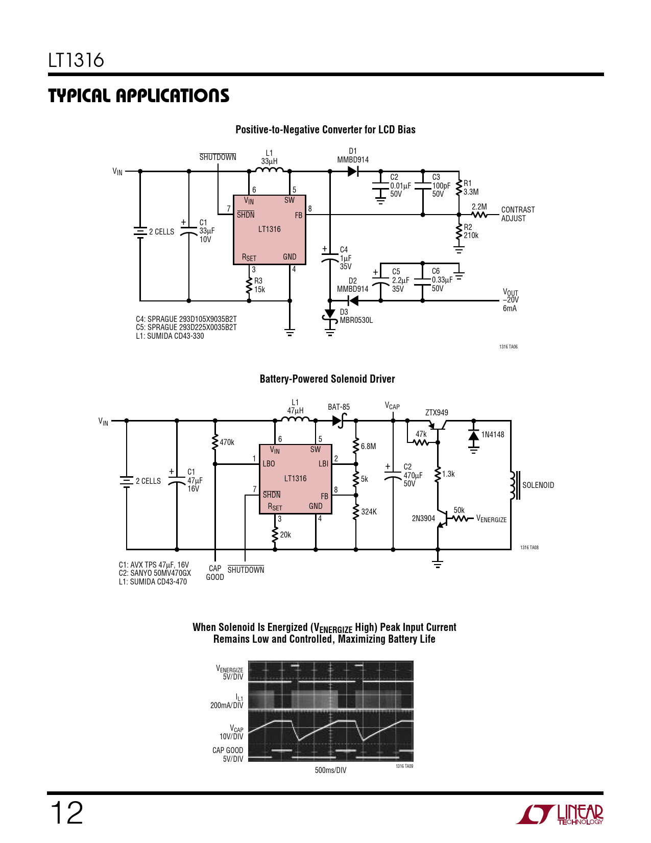 L1 BAT-85 VCAP 47µH ZTX949 VIN 47k 1N4148 6 5 470k V 6.8M IN SW 1 2 LBO LBI + + C2 C1 470 F 1.3k µ LT1316 2 CELLS 47µF 5k 50V SOLENOID 16V 7 8 SHDN FB RSET GND 324K 50k 3 4 2N3904 VENERGIZE 20k 1316 TA08 C1: AVX TPS 47µF, 16V CAP SHUTDOWN C2: SANYO 50MV470GX GOOD L1: SUMIDA CD43-470