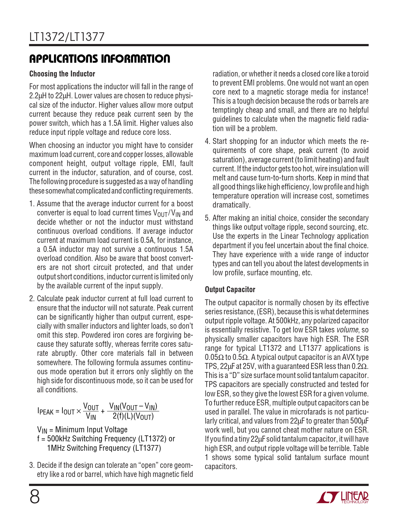 2. Calculate peak inductor current at full load current to The output capacitor is normally chosen by its effective ensure that the inductor will not saturate. Peak current series resistance, (ESR), because this is what determines can be significantly higher than output current, espe- output ripple voltage. At 500kHz, any polarized capacitor cially with smaller inductors and lighter loads, so don’t is essentially resistive. To get low ESR takes volume, so omit this step. Powdered iron cores are forgiving be- physically smaller capacitors have high ESR. The ESR cause they saturate softly, whereas ferrite cores satu- range for typical LT1372 and LT1377 applications is rate abruptly. Other core materials fall in between 0.05Ω to 0.5Ω. A typical output capacitor is an AVX type somewhere. The following formula assumes continu- TPS, 22µF at 25V, with a guaranteed ESR less than 0.2Ω. ous mode operation but it errors only slightly on the This is a “D” size surface mount solid tantalum capacitor. high side for discontinuous mode, so it can be used for TPS capacitors are specially constructed and tested for all conditions. low ESR, so they give the lowest ESR for a given volume. V V To further reduce ESR, multiple output capacitors can be I OUT IN(VOUT – VIN) PEAK = IOUT × + used in parallel. The value in microfarads is not particu- VIN 2(f)(L)(VOUT) larly critical, and values from 22µF to greater than 500µF VIN = Minimum Input Voltage work well, but you cannot cheat mother nature on ESR. f = 500kHz Switching Frequency (LT1372) or If you find a tiny 22µF solid tantalum capacitor, it will have 1MHz Switching Frequency (LT1377) high ESR, and output ripple voltage will be terrible. Table 1 shows some typical solid tantalum surface mount 3. Decide if the design can tolerate an “open” core geom- capacitors. etry like a rod or barrel, which have high magnetic field 8