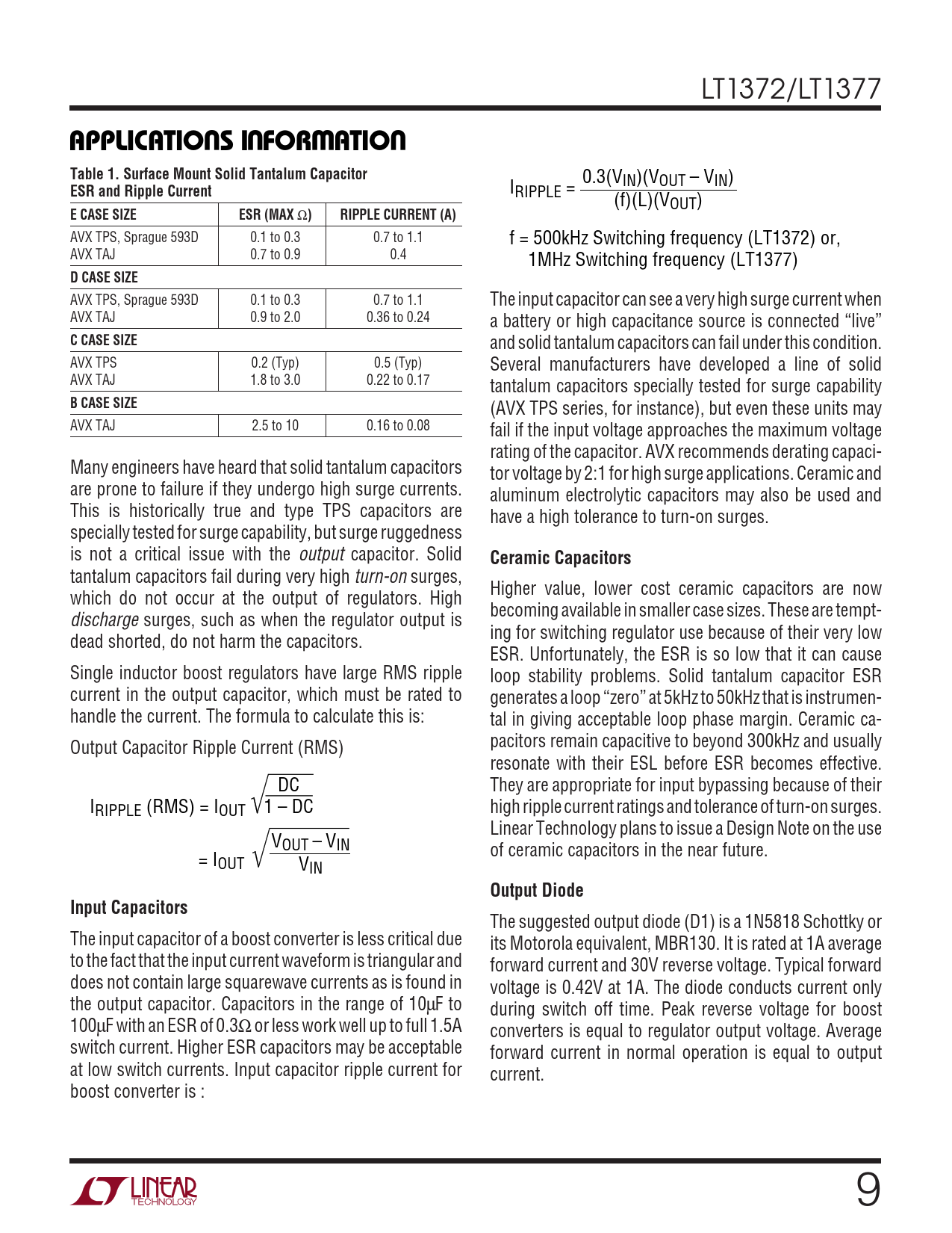 AVX TPS, Sprague 593D 0.1 to 0.3 0.7 to 1.1 f = 500kHz Switching frequency (LT1372) or, AVX TAJ 0.7 to 0.9 0.4 1MHz Switching frequency (LT1377)