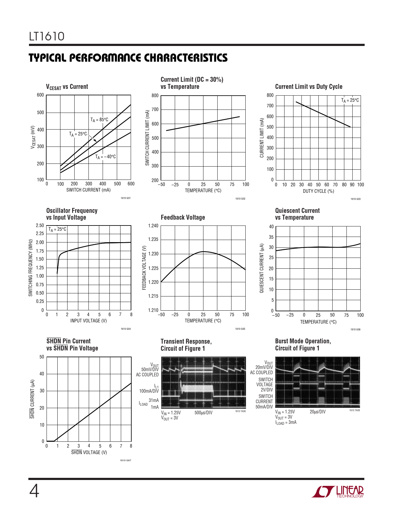 600 800 800 TA = 25°C 700 700 500 600 TA = 85°C 600 500 400 (mV) TA = 25°C 500 400 CESATV 300 300 400 TA = – 40°C CURRENT LIMIT (mA) 200 200 SWITCH CURRENT LIMIT (mA) 300 100 100 200 0 0 100 200 300 400 500 600 –50 –25 0 25 50 75 100 0 10 20 30 40 50 60 70 80 90 100 SWITCH CURRENT (mA) TEMPERATURE (°C) DUTY CYCLE (%) 1610 G01 1610 G02 1610 G03
