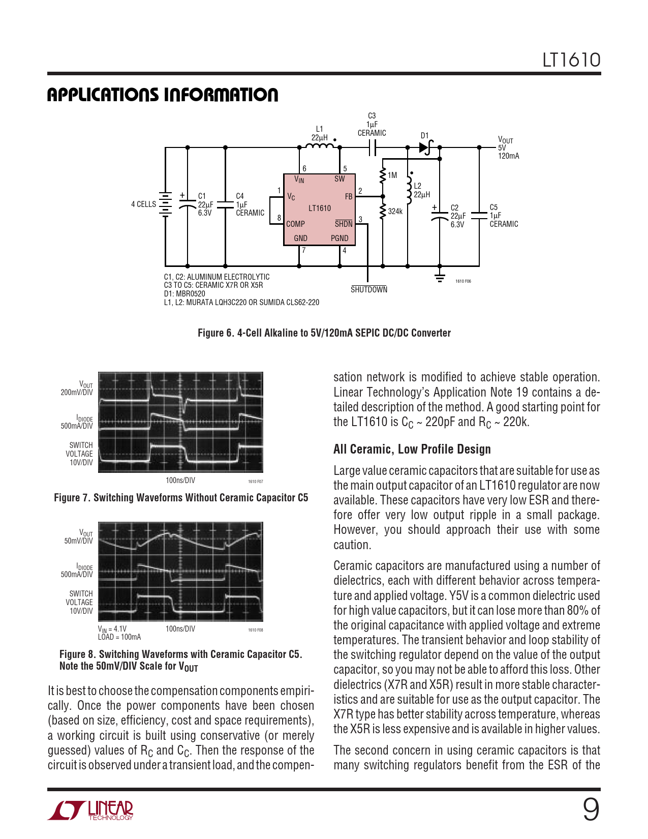 APPLICATIONS INFORMATION. Figure 6. 4-Cell Alkaline to 5V/120mA SEPIC DC/DC Converter. All Ceramic, Low Profile Design