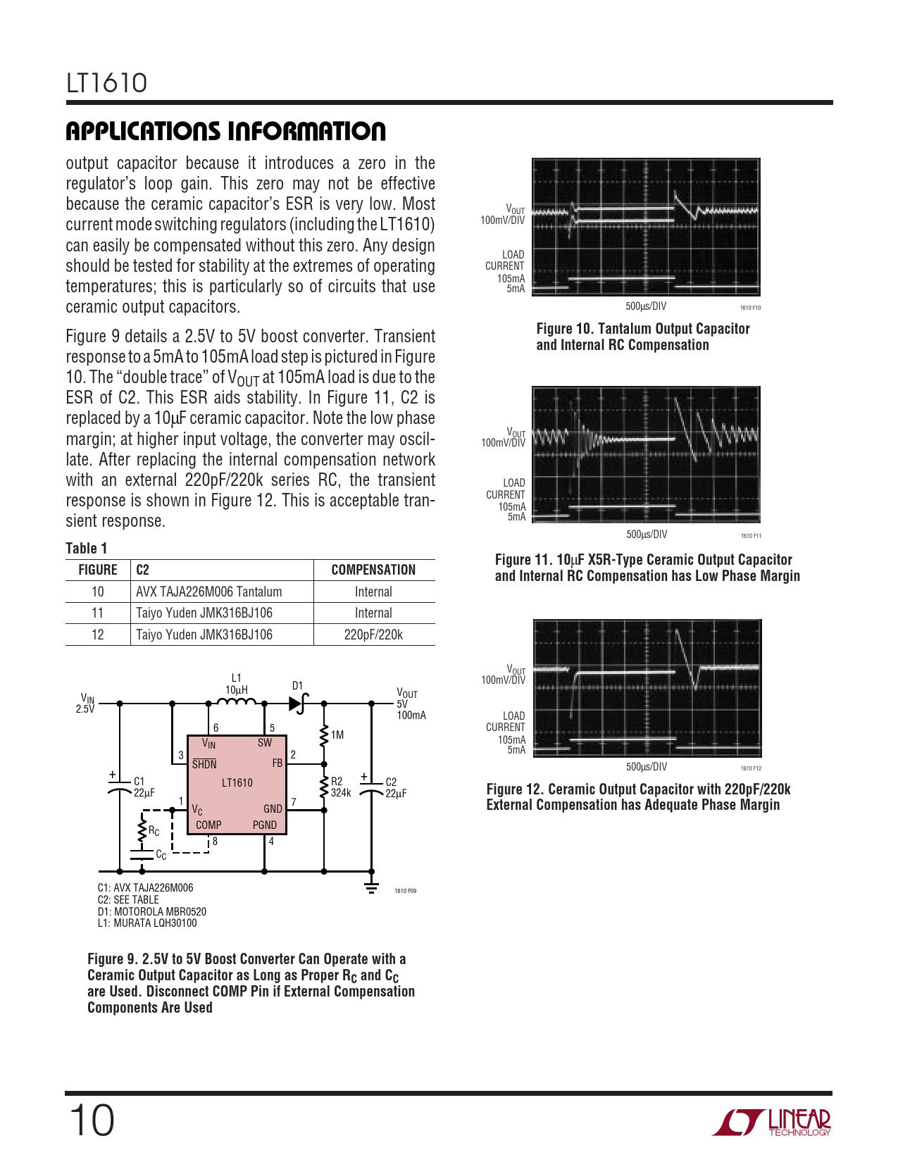 LT1610 UUWUAPPLICATIONS INFORMATION output capacitor because it introduces a zero in the regulator’s loop gain. This zero may not be effective because the ceramic capacitor’s ESR is very low. Most VOUT current mode switching regulators (including the LT1610) 100mV/DIV can easily be compensated without this zero. Any design LOAD should be tested for stability at the extremes of operating CURRENT temperatures; this is particularly so of circuits that use 105mA 5mA ceramic output capacitors. 500µs/DIV 1610 F10 Figure 9 details a 2.5V to 5V boost converter. Transient Figure 10. Tantalum Output Capacitor and Internal RC Compensation response to a 5mA to 105mA load step is pictured in Figure 10. The “double trace” of VOUT at 105mA load is due to the ESR of C2. This ESR aids stability. In Figure 11, C2 is replaced by a 10µF ceramic capacitor. Note the low phase margin; at higher input voltage, the converter may oscil- VOUT 100mV/DIV late. After replacing the internal compensation network with an external 220pF/220k series RC, the transient LOAD response is shown in Figure 12. This is acceptable tran- CURRENT 105mA sient response. 5mA 500µs/DIV 1610 F11 Table 1Figure 11. 10 µ F X5R-Type Ceramic Output CapacitorFIGUREC2COMPENSATIONand Internal RC Compensation has Low Phase Margin 10 AVX TAJA226M006 Tantalum Internal 11 Taiyo Yuden JMK316BJ106 Internal 12 Taiyo Yuden JMK316BJ106 220pF/220k VOUT L1 100mV/DIV 10µH D1 VOUT VIN 5V 2.5V 100mA LOAD 6 5 CURRENT 1M V 105mA IN SW 5mA 3 2 SHDN FB 500µs/DIV + 1610 F12 + C1 LT1610 R2 C2 22µF 324k 22µF Figure 12. Ceramic Output Capacitor with 220pF/220k 1 7 V GND External Compensation has Adequate Phase Margin C COMP PGND RC 8 4 CC C1: AVX TAJA226M006 1610 F09 C2: SEE TABLE D1: MOTOROLA MBR0520 L1: MURATA LQH30100 Figure 9. 2.5V to 5V Boost Converter Can Operate with a Ceramic Output Capacitor as Long as Proper RC and CCare Used. Disconnect COMP Pin if External Compensation Components Are Used 10