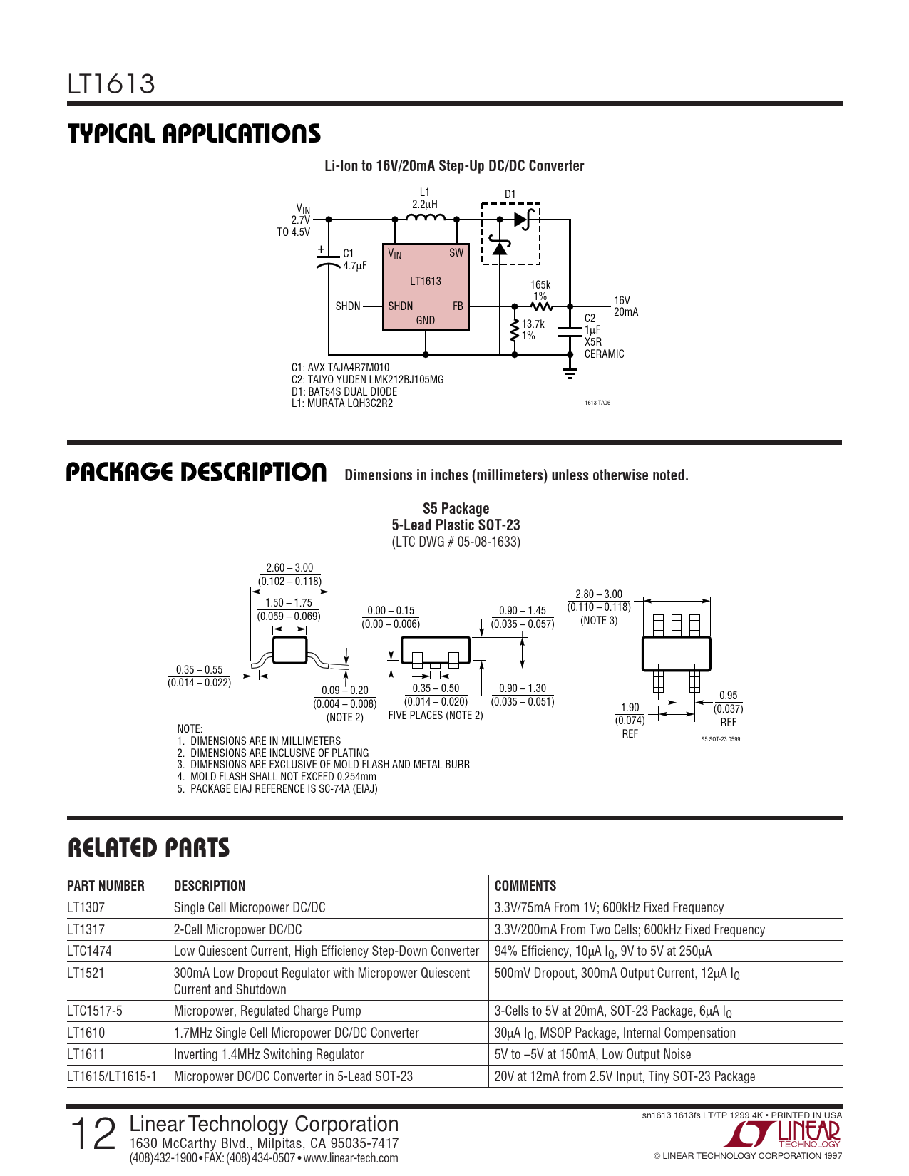 LT1307 Single Cell Micropower DC/DC 3.3V/75mA From 1V; 600kHz Fixed Frequency LT1317 2-Cell Micropower DC/DC 3.3V/200mA From Two Cells; 600kHz Fixed Frequency LTC1474 Low Quiescent Current, High Efficiency Step-Down Converter 94% Efficiency, 10µA IQ, 9V to 5V at 250µA LT1521 300mA Low Dropout Regulator with Micropower Quiescent 500mV Dropout, 300mA Output Current, 12µA IQ Current and Shutdown LTC1517-5 Micropower, Regulated Charge Pump 3-Cells to 5V at 20mA, SOT-23 Package, 6µA IQ LT1610 1.7MHz Single Cell Micropower DC/DC Converter 30µA IQ, MSOP Package, Internal Compensation LT1611 Inverting 1.4MHz Switching Regulator 5V to –5V at 150mA, Low Output Noise LT1615/LT1615-1 Micropower DC/DC Converter in 5-Lead SOT-23 20V at 12mA from 2.5V Input, Tiny SOT-23 Package sn1613 1613fs LT/TP 1299 4K • PRINTED IN USA 12 Linear Technology Corporation 1630 McCarthy Blvd., Milpitas, CA 95035-7417 LINEAR TECHNOLOGY CORPORATION 1997 (408) 432-1900 ● FAX: (408) 434-0507 ● www.linear-tech.com