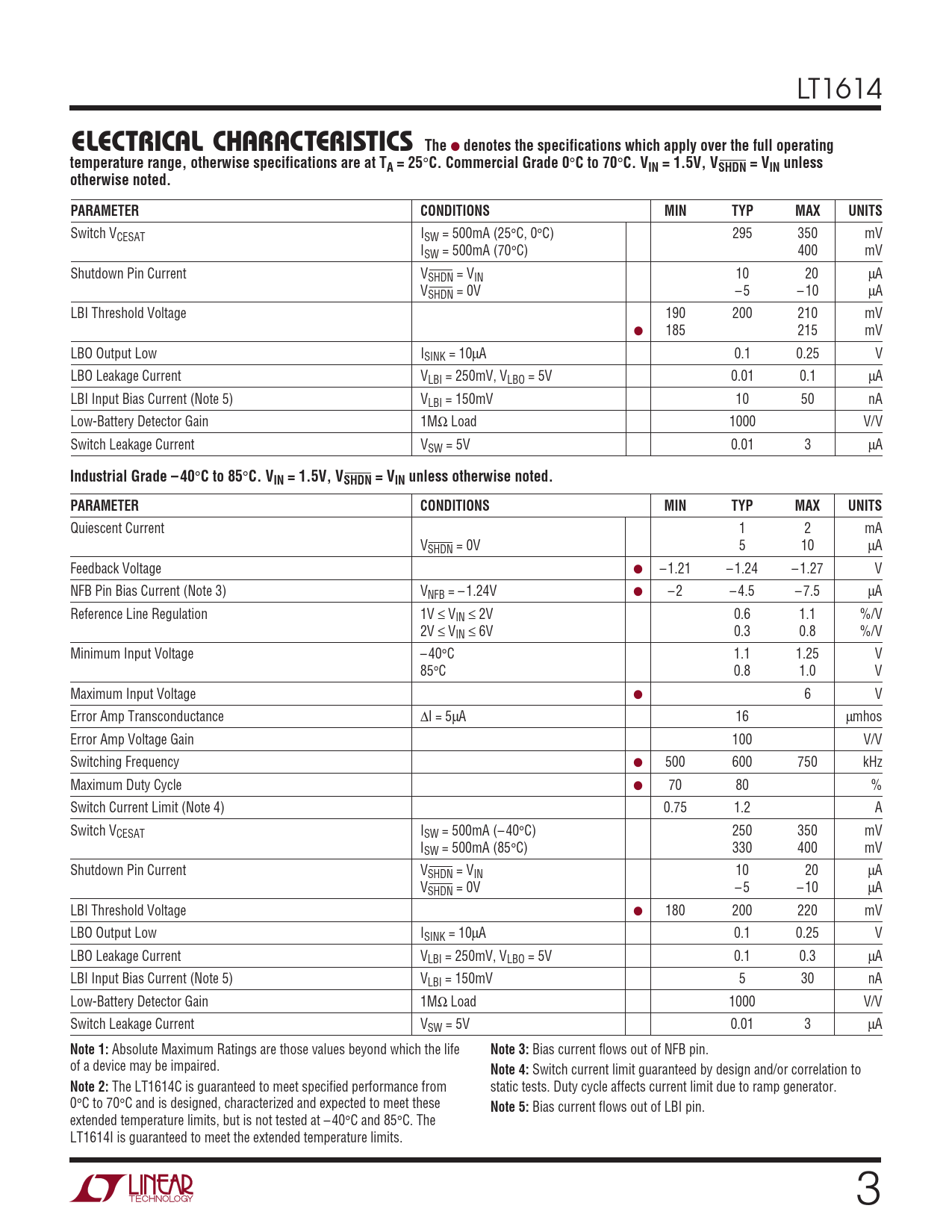LT1614 ELECTRICAL CHCARA TERISTICS The ● denotes the specifications which apply over the full operatingtemperature range, otherwise specifications are at TA = 25 ° C. Commercial Grade 0 ° C to 70 ° C. VIN = 1.5V, VSHDN = VIN unlessotherwise noted.PARAMETERCONDITIONSMINTYPMAXUNITS Switch VCESAT ISW = 500mA (25°C, 0°C) 295 350 mV ISW = 500mA (70°C) 400 mV Shutdown Pin Current VSHDN = VIN 10 20 µA VSHDN = 0V – 5 – 10 µA LBI Threshold Voltage 190 200 210 mV ● 185 215 mV LBO Output Low ISINK = 10µA 0.1 0.25 V LBO Leakage Current VLBI = 250mV, VLBO = 5V 0.01 0.1 µA LBI Input Bias Current (Note 5) VLBI = 150mV 10 50 nA Low-Battery Detector Gain 1MΩ Load 1000 V/V Switch Leakage Current VSW = 5V 0.01 3 µA Industrial Grade – 40 ° C to 85 ° C. VIN = 1.5V, VSHDN = VIN unless otherwise noted.PARAMETERCONDITIONSMINTYPMAXUNITS Quiescent Current 1 2 mA VSHDN = 0V 5 10 µA Feedback Voltage ● – 1.21 – 1.24 – 1.27 V NFB Pin Bias Current (Note 3) VNFB = – 1.24V ● – 2 – 4.5 – 7.5 µA Reference Line Regulation 1V ≤ VIN ≤ 2V 0.6 1.1 %/V 2V ≤ VIN ≤ 6V 0.3 0.8 %/V Minimum Input Voltage – 40°C 1.1 1.25 V 85°C 0.8 1.0 V Maximum Input Voltage ● 6 V Error Amp Transconductance ∆I = 5µA 16 µmhos Error Amp Voltage Gain 100 V/V Switching Frequency ● 500 600 750 kHz Maximum Duty Cycle ● 70 80 % Switch Current Limit (Note 4) 0.75 1.2 A Switch VCESAT ISW = 500mA (– 40°C) 250 350 mV ISW = 500mA (85°C) 330 400 mV Shutdown Pin Current VSHDN = VIN 10 20 µA VSHDN = 0V – 5 – 10 µA LBI Threshold Voltage ● 180 200 220 mV LBO Output Low ISINK = 10µA 0.1 0.25 V LBO Leakage Current VLBI = 250mV, VLBO = 5V 0.1 0.3 µA LBI Input Bias Current (Note 5) VLBI = 150mV 5 30 nA Low-Battery Detector Gain 1MΩ Load 1000 V/V Switch Leakage Current VSW = 5V 0.01 3 µA Note 1: Absolute Maximum Ratings are those values beyond which the life Note 3: Bias current flows out of NFB pin. of a device may be impaired. Note 4: Switch current limit guaranteed by design and/or correlation to Note 2: The LT1614C is guaranteed to meet specified performance from static tests. Duty cycle affects current limit due to ramp generator. 0°C to 70°C and is designed, characterized and expected to meet these Note 5: Bias current flows out of LBI pin. extended temperature limits, but is not tested at – 40°C and 85°C. The LT1614I is guaranteed to meet the extended temperature limits. 3