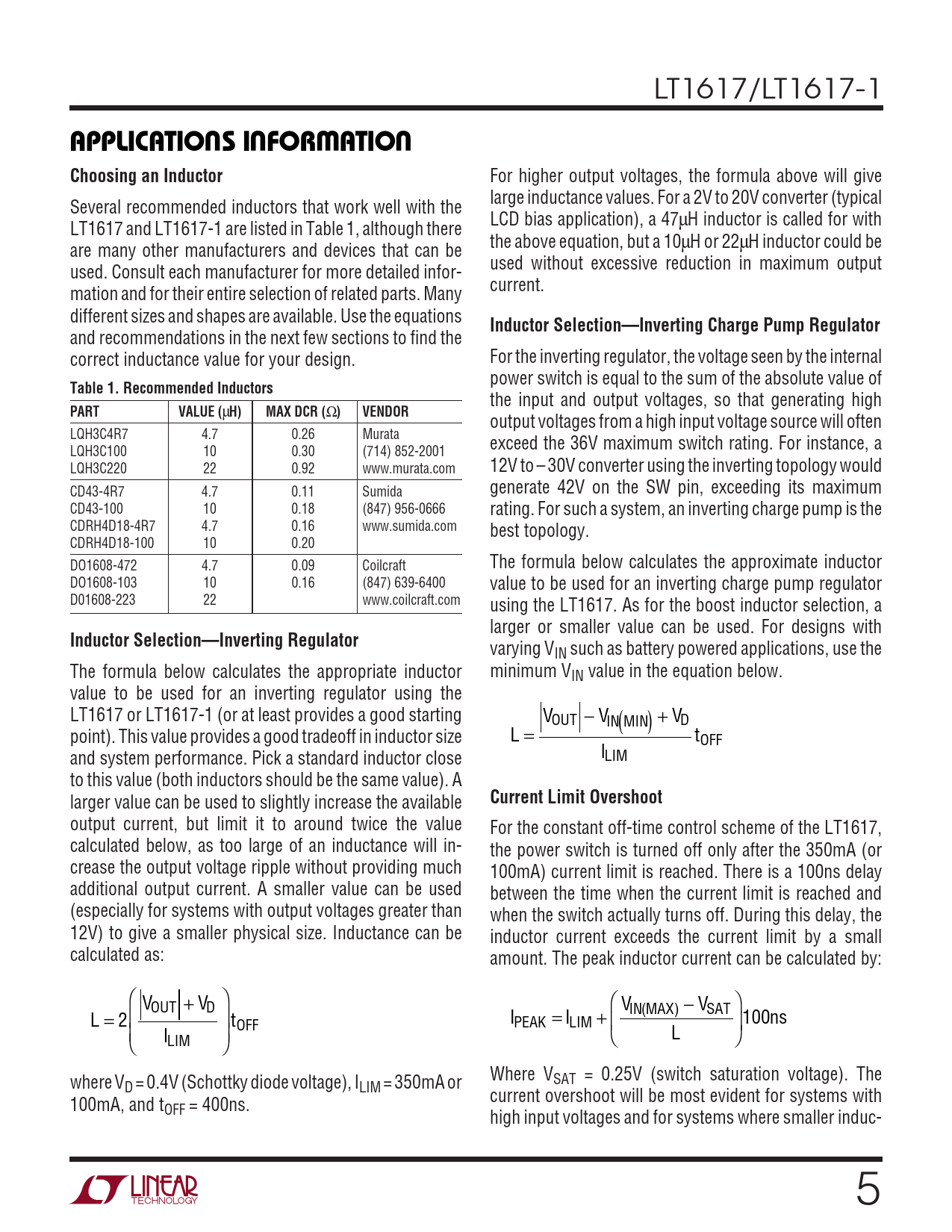 For higher output voltages, the formula above will give large inductance values. For a 2V to 20V converter (typical Several recommended inductors that work well with the LCD bias application), a 47µH inductor is called for with LT1617 and LT1617-1 are listed in Table 1, although there the above equation, but a 10µH or 22µH inductor could be are many other manufacturers and devices that can be used without excessive reduction in maximum output used. Consult each manufacturer for more detailed infor- current. mation and for their entire selection of related parts. Many different sizes and shapes are available. Use the equations