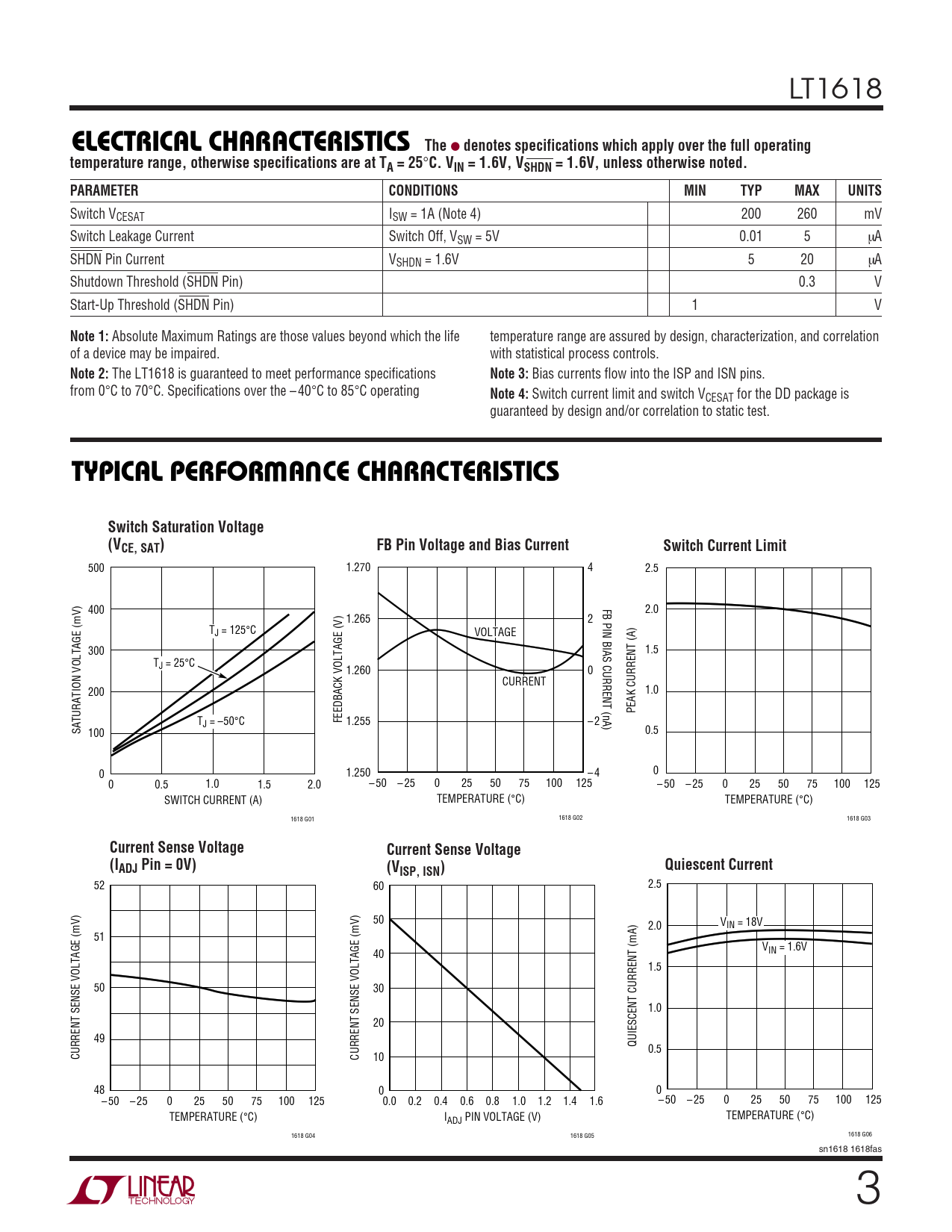 500 1.270 4 2.5 FB PIN BIAS CURRENT (nA) 400 2.0 1.265 2 TJ = 125°C VOLTAGE 300 1.5 TJ = 25°C 1.260 0 CURRENT 1.0 200 PEAK CURRENT (A) T FEEDBACK VOLTAGE (V) J = –50°C 1.255 – 2 SATURATION VOLTAGE (mV) 0.5 100 0 1.250 – 4 0 0 0.5 1.0 1.5 2.0 – 50 – 25 0 25 50 75 100 125 – 50 – 25 0 25 50 75 100 125 SWITCH CURRENT (A) TEMPERATURE (°C) TEMPERATURE (°C) 1618 G02 1618 G01 1618 G03
