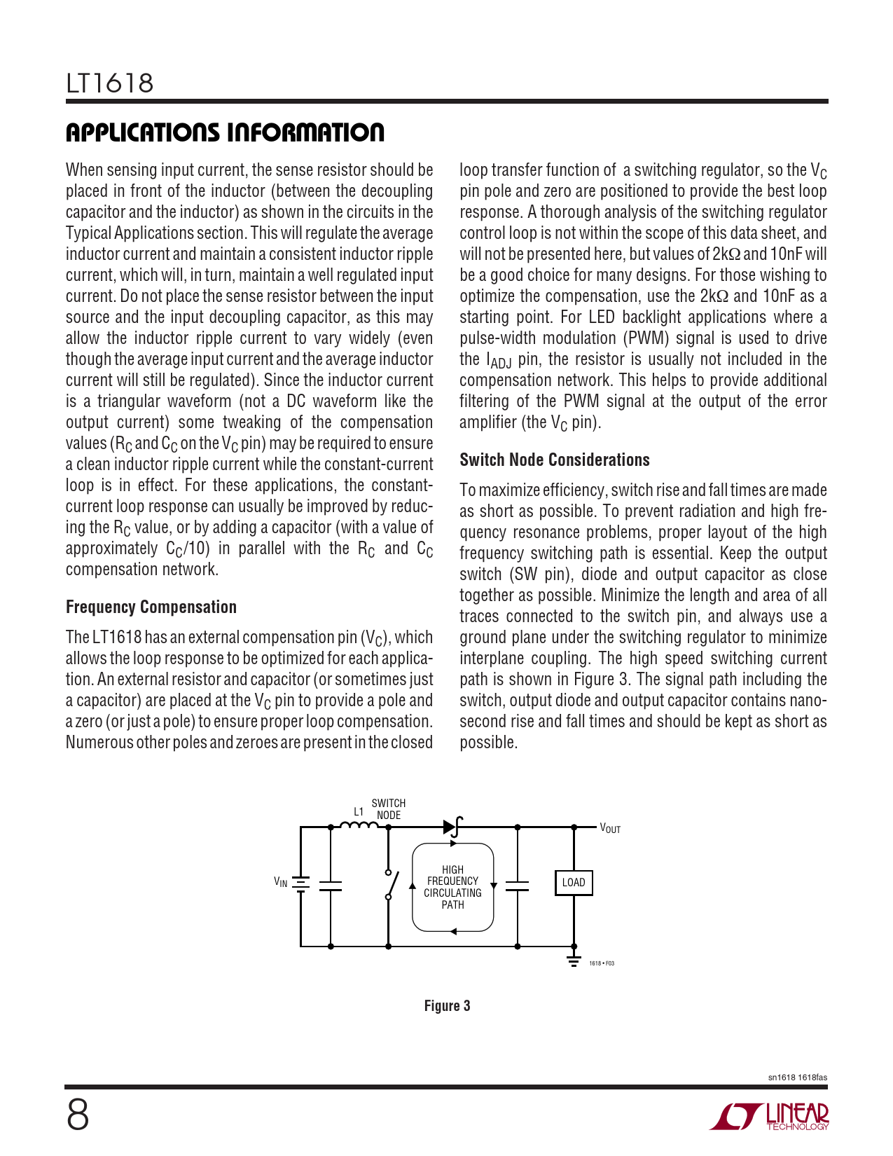 LT1618 UUWUAPPLICATIONS INFORMATION When sensing input current, the sense resistor should be loop transfer function of a switching regulator, so the VC placed in front of the inductor (between the decoupling pin pole and zero are positioned to provide the best loop capacitor and the inductor) as shown in the circuits in the response. A thorough analysis of the switching regulator Typical Applications section. This will regulate the average control loop is not within the scope of this data sheet, and inductor current and maintain a consistent inductor ripple will not be presented here, but values of 2kΩ and 10nF will current, which will, in turn, maintain a well regulated input be a good choice for many designs. For those wishing to current. Do not place the sense resistor between the input optimize the compensation, use the 2kΩ and 10nF as a source and the input decoupling capacitor, as this may starting point. For LED backlight applications where a allow the inductor ripple current to vary widely (even pulse-width modulation (PWM) signal is used to drive though the average input current and the average inductor the IADJ pin, the resistor is usually not included in the current will still be regulated). Since the inductor current compensation network. This helps to provide additional is a triangular waveform (not a DC waveform like the filtering of the PWM signal at the output of the error output current) some tweaking of the compensation amplifier (the VC pin). values (RC and CC on the VC pin) may be required to ensure a clean inductor ripple current while the constant-current Switch Node Considerations loop is in effect. For these applications, the constant- To maximize efficiency, switch rise and fall times are made current loop response can usually be improved by reduc- as short as possible. To prevent radiation and high fre- ing the RC value, or by adding a capacitor (with a value of quency resonance problems, proper layout of the high approximately CC/10) in parallel with the RC and CC frequency switching path is essential. Keep the output compensation network. switch (SW pin), diode and output capacitor as close together as possible. Minimize the length and area of all Frequency Compensation traces connected to the switch pin, and always use a The LT1618 has an external compensation pin (VC), which ground plane under the switching regulator to minimize allows the loop response to be optimized for each applica- interplane coupling. The high speed switching current tion. An external resistor and capacitor (or sometimes just path is shown in Figure 3. The signal path including the a capacitor) are placed at the VC pin to provide a pole and switch, output diode and output capacitor contains nano- a zero (or just a pole) to ensure proper loop compensation. second rise and fall times and should be kept as short as Numerous other poles and zeroes are present in the closed possible. SWITCH L1 NODE VOUT HIGH VIN FREQUENCY LOAD CIRCULATING PATH 1618 • F03 Figure 3 sn1618 1618fas 8