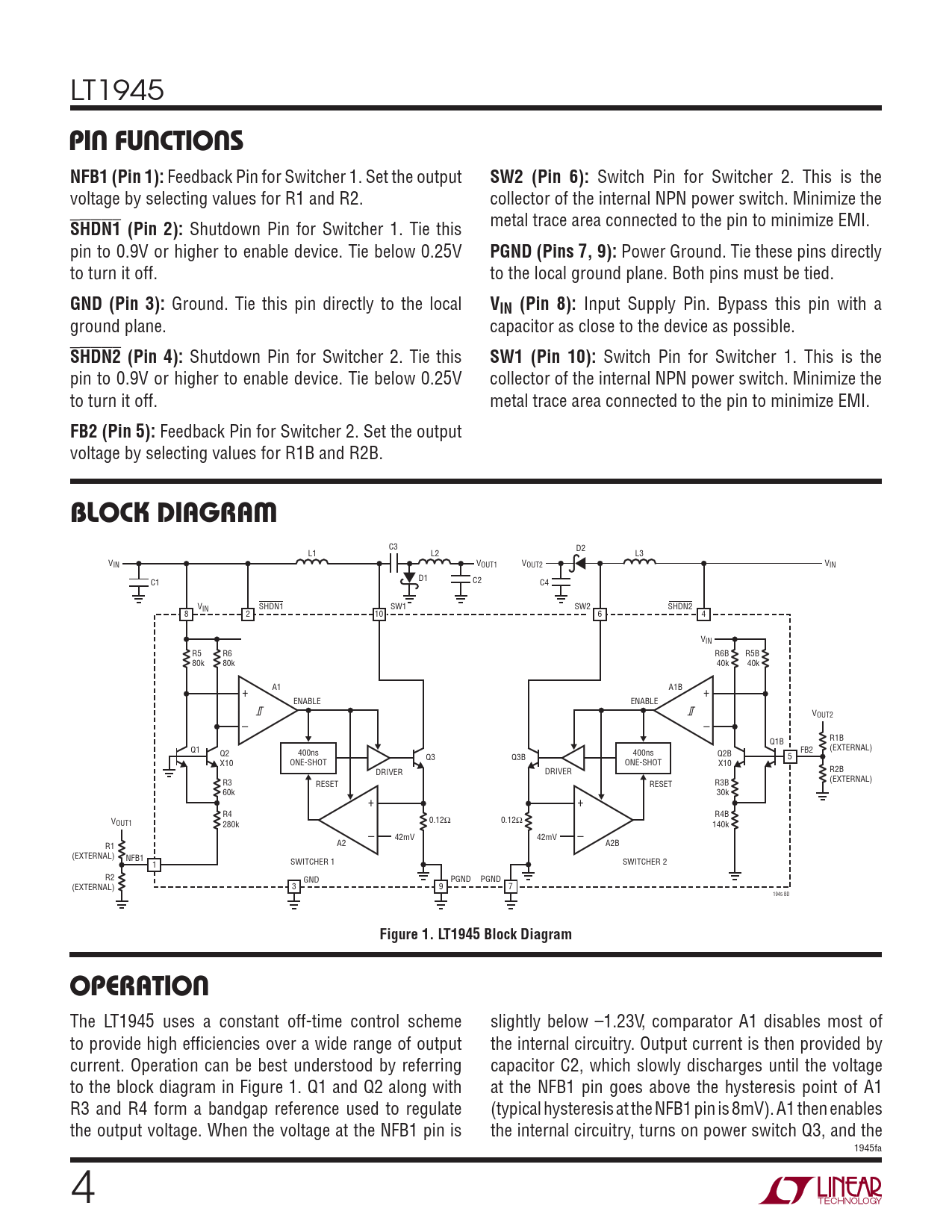 LT1945 PIN FUNCTIONSNFB1 (Pin 1): Feedback Pin for Switcher 1. Set the output SW2 (Pin 6): Switch Pin for Switcher 2. This is the voltage by selecting values for R1 and R2. collector of the internal NPN power switch. Minimize the SHDN1 metal trace area connected to the pin to minimize EMI. (Pin 2): Shutdown Pin for Switcher 1. Tie this pin to 0.9V or higher to enable device. Tie below 0.25V PGND (Pins 7, 9): Power Ground. Tie these pins directly to turn it off. to the local ground plane. Both pins must be tied. GND (Pin 3): Ground. Tie this pin directly to the local VIN (Pin 8): Input Supply Pin. Bypass this pin with a ground plane. capacitor as close to the device as possible. SHDN2 (Pin 4): Shutdown Pin for Switcher 2. Tie this SW1 (Pin 10): Switch Pin for Switcher 1. This is the pin to 0.9V or higher to enable device. Tie below 0.25V collector of the internal NPN power switch. Minimize the to turn it off. metal trace area connected to the pin to minimize EMI. FB2 (Pin 5): Feedback Pin for Switcher 2. Set the output voltage by selecting values for R1B and R2B. BLOCK DIAGRAM C3 D2 L1 L2 L3 V V IN OUT1 VOUT2 VIN D1 C2 C1 C4 VIN SHDN1 SW1 SW2 SHDN2 8 2 10 6 4 VIN R5 R6 R6B R5B 80k 80k 40k 40k A1 A1B + + ENABLE ENABLE VOUT2 – – Q1B R1B Q1 (EXTERNAL) Q2 400ns 400ns Q2B FB2 Q3 Q3B 5 X10 ONE-SHOT ONE-SHOT X10 DRIVER R2B DRIVER R3 (EXTERNAL) RESET RESET R3B 60k 30k + + R4 R4B V 0.12Ω 0.12Ω OUT1 280k 140k – 42mV 42mV – A2 R1 A2B (EXTERNAL) NFB1 1 SWITCHER 1 SWITCHER 2 R2 GND PGND PGND (EXTERNAL) 3 9 7 1945 BD Figure 1. LT1945 Block DiagramOPERATION The LT1945 uses a constant off-time control scheme slightly below –1.23V, comparator A1 disables most of to provide high effi ciencies over a wide range of output the internal circuitry. Output current is then provided by current. Operation can be best understood by referring capacitor C2, which slowly discharges until the voltage to the block diagram in Figure 1. Q1 and Q2 along with at the NFB1 pin goes above the hysteresis point of A1 R3 and R4 form a bandgap reference used to regulate (typical hysteresis at the NFB1 pin is 8mV). A1 then enables the output voltage. When the voltage at the NFB1 pin is the internal circuitry, turns on power switch Q3, and the 1945fa 4