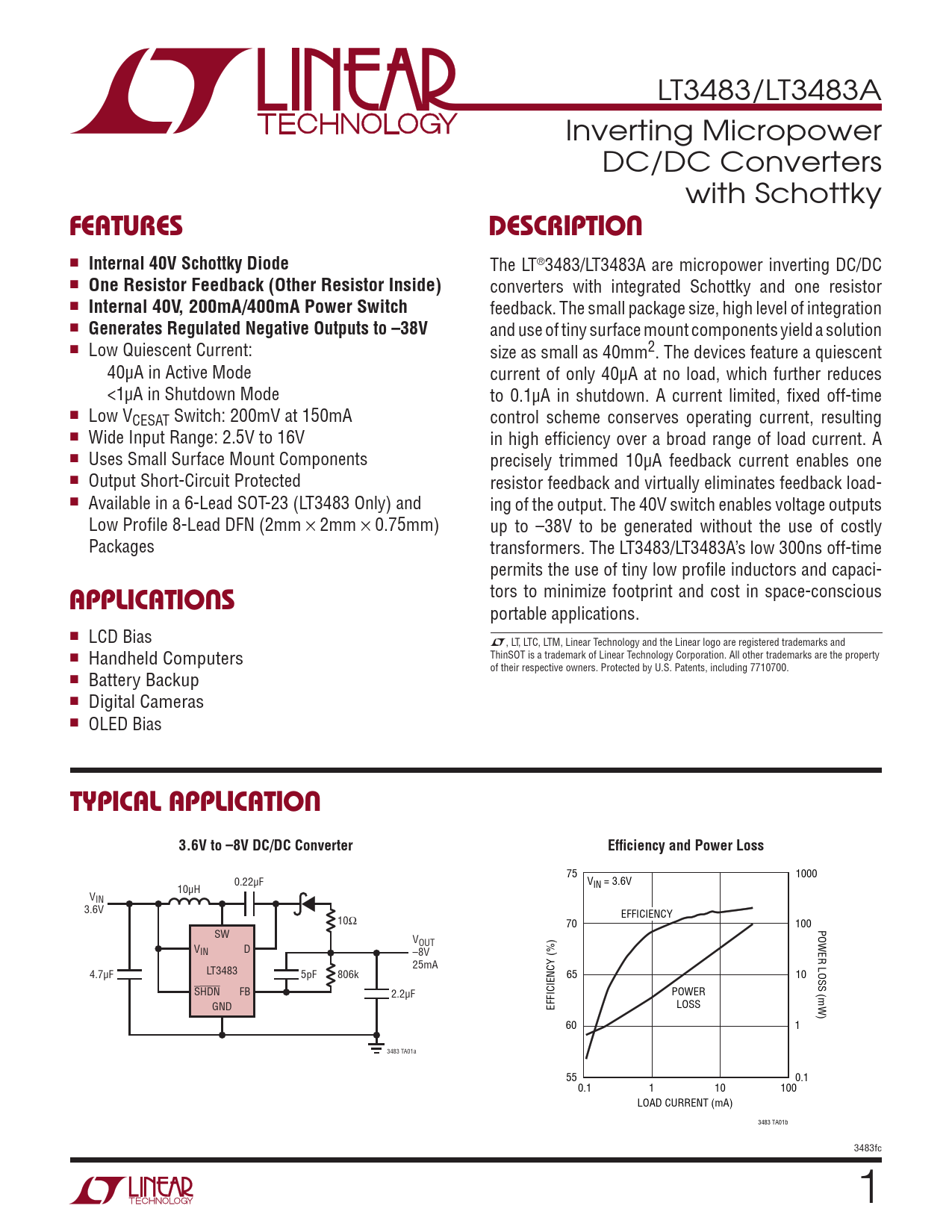 LT3483/LT3483A Inverting Micropower DC/DC Converters with Schottky FEATURESDESCRIPTION n Internal 40V Schottky Diode The LT®3483/LT3483A are micropower inverting DC/DC n One Resistor Feedback (Other Resistor Inside) converters with integrated Schottky and one resistor n Internal 40V, 200mA/400mA Power Switch feedback. The small package size, high level of integration n Generates Regulated Negative Outputs to –38V and use of tiny surface mount components yield a solution n Low Quiescent Current: size as small as 40mm2. The devices feature a quiescent 40µA in Active Mode current of only 40µA at no load, which further reduces <1µA in Shutdown Mode to 0.1µA in shutdown. A current limited, fixed off-time n Low VCESAT Switch: 200mV at 150mA control scheme conserves operating current, resulting n Wide Input Range: 2.5V to 16V in high efficiency over a broad range of load current. A n Uses Small Surface Mount Components precisely trimmed 10µA feedback current enables one n Output Short-Circuit Protected resistor feedback and virtually eliminates feedback load- n Available in a 6-Lead SOT-23 (LT3483 Only) and ing of the output. The 40V switch enables voltage outputs Low Profile 8-Lead DFN (2mm × 2mm × 0.75mm) up to –38V to be generated without the use of costly Packages transformers. The LT3483/LT3483A’s low 300ns off-time permits the use of tiny low profile inductors and capaci- APPLICATIONS tors to minimize footprint and cost in space-conscious portable applications. n LCD Bias L, LT, LTC, LTM, Linear Technology and the Linear logo are registered trademarks and n Handheld Computers ThinSOT is a trademark of Linear Technology Corporation. All other trademarks are the property of their respective owners. Protected by U.S. Patents, including 7710700. n Battery Backup n Digital Cameras n OLED Bias TYPICAL APPLICATION3.6V to –8V DC/DC ConverterEfficiency and Power Loss 75 1000 0.22µF V 10µH IN = 3.6V VIN 3.6V 10Ω EFFICIENCY 70 100 POWER LOSS (mW) SW V V OUT IN D –8V LT3483 25mA 4.7µF 5pF 806k 65 10 SHDN FB 2.2µF POWER GND EFFICIENCY (%) LOSS 60 1 3483 TA01a 55 0.1 0.1 1 10 100 LOAD CURRENT (mA) 3483 TA01b 3483fc 1 Document Outline Features Description Applications Typical Application Absolute Maximum Ratings Pin Configuration order information Electrical Characteristics Typical Performance Characteristics pin functions block diagram operation applications information typical applications Package Description Revision History Typical Application Related Parts