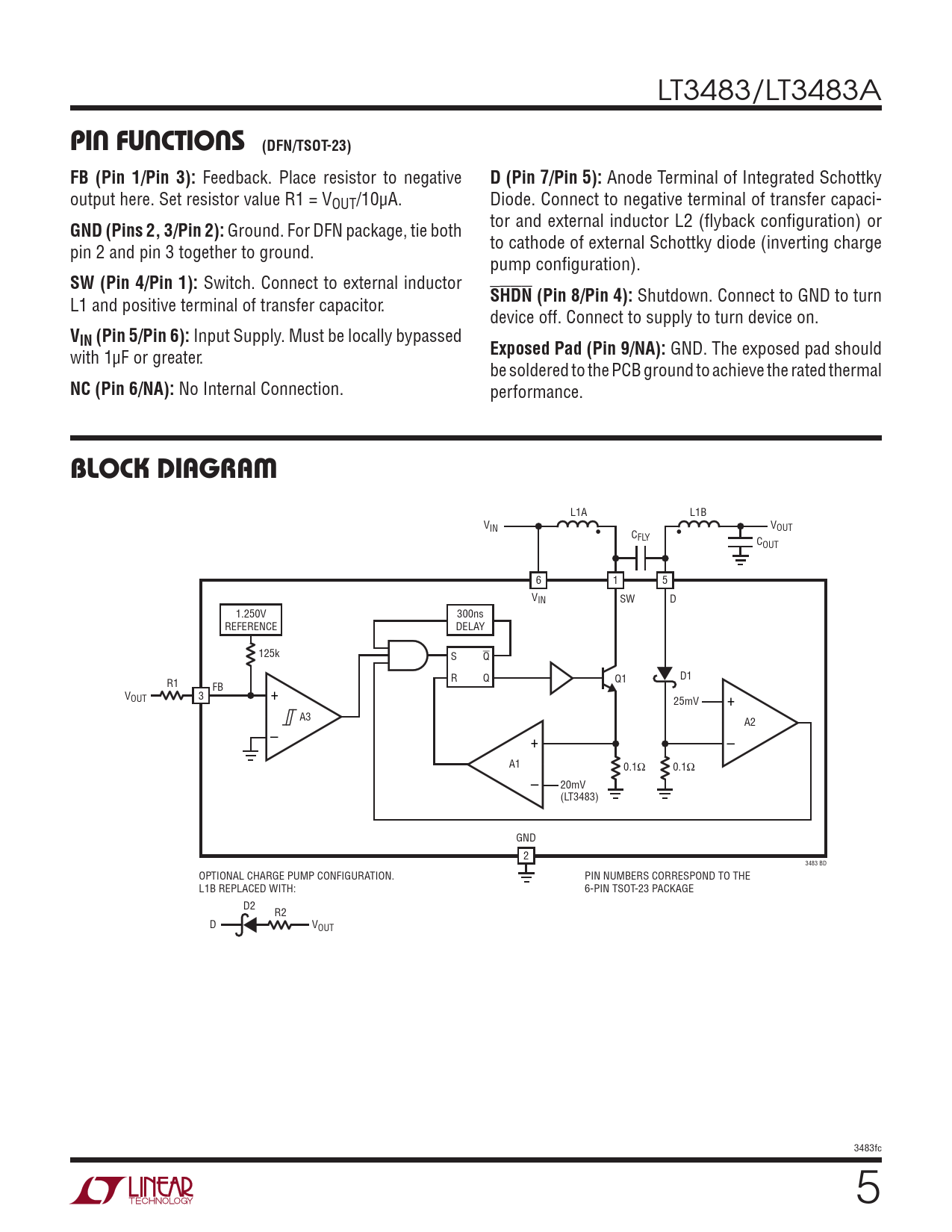 LT3483/LT3483A PIN FUNCTIONS (DFN/TSOT-23) FB (Pin 1/Pin 3): Feedback. Place resistor to negative D (Pin 7/Pin 5): Anode Terminal of Integrated Schottky output here. Set resistor value R1 = VOUT/10µA. Diode. Connect to negative terminal of transfer capaci- GND (Pins 2, 3/Pin 2): Ground. For DFN package, tie both tor and external inductor L2 (flyback configuration) or pin 2 and pin 3 together to ground. to cathode of external Schottky diode (inverting charge pump configuration). SW (Pin 4/Pin 1): Switch. Connect to external inductor L1 and positive terminal of transfer capacitor. SHDN (Pin 8/Pin 4): Shutdown. Connect to GND to turn device off. Connect to supply to turn device on. VIN (Pin 5/Pin 6): Input Supply. Must be locally bypassed with 1µF or greater. Exposed Pad (Pin 9/NA): GND. The exposed pad should be soldered to the PCB ground to achieve the rated thermal NC (Pin 6/NA): No Internal Connection. performance. BLOCK DIAGRAM L1A L1B VIN VOUT • CFLY • COUT 6 1 5 VIN SW D 1.250V 300ns REFERENCE DELAY 125k S Q R Q Q1 D1 R1 FB VOUT 3 + 25mV + A3 A2 – + – A1 0.1Ω 0.1Ω – 20mV (LT3483) GND 2 3483 BD OPTIONAL CHARGE PUMP CONFIGURATION. PIN NUMBERS CORRESPOND TO THE L1B REPLACED WITH: 6-PIN TSOT-23 PACKAGE D2 R2 D VOUT 3483fc 5 Document Outline Features Description Applications Typical Application Absolute Maximum Ratings Pin Configuration order information Electrical Characteristics Typical Performance Characteristics pin functions block diagram operation applications information typical applications Package Description Revision History Typical Application Related Parts
