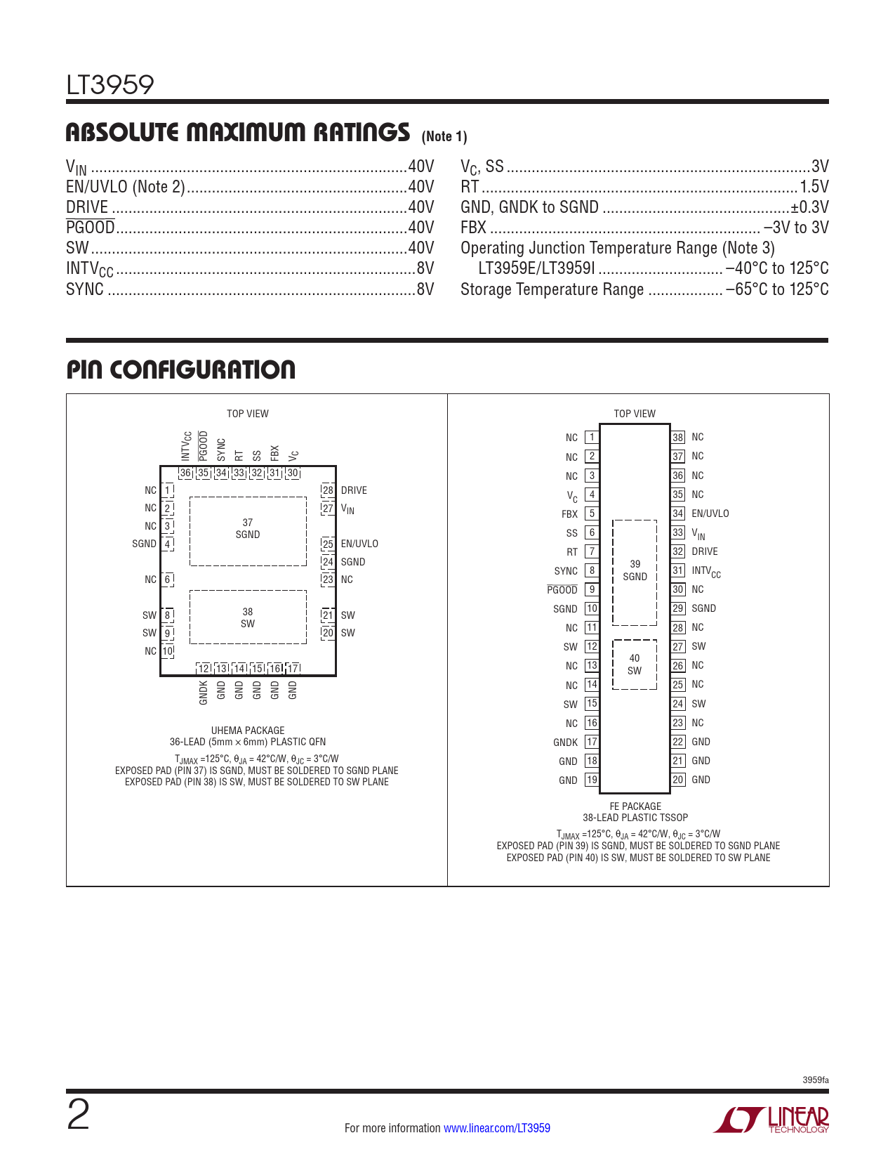VIN ..40V VC, SS ...3V EN/UVLO (Note 2) ...40V RT ..1.5V DRIVE ...40V GND, GNDK to SGND ...±0.3V PGOOD ..40V FBX ... –3V to 3V SW ..40V Operating Junction Temperature Range (Note 3) INTVCC ..8V LT3959E/LT3959I .. –40°C to 125°C SYNC ..8V Storage Temperature Range .. –65°C to 125°C
