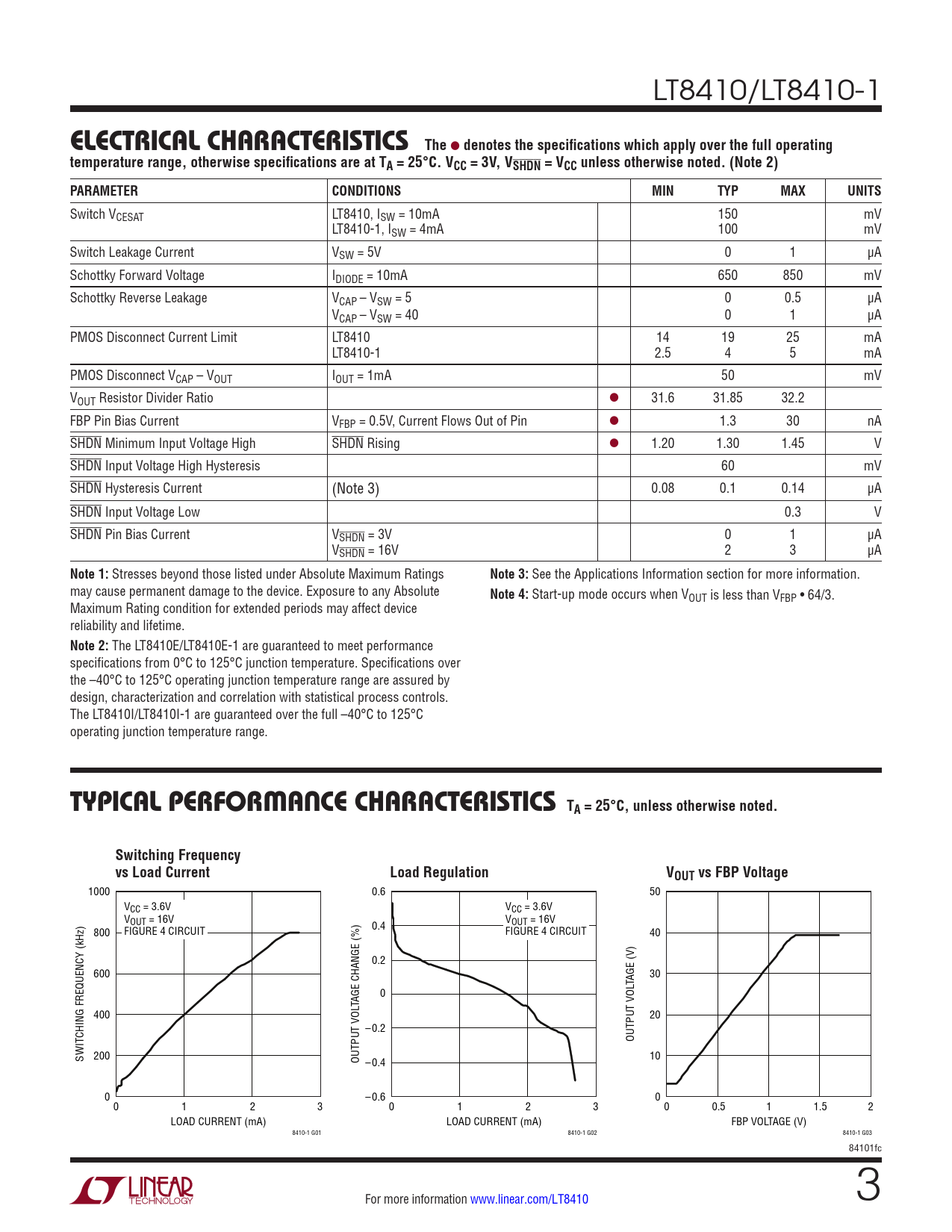 Switch VCESAT LT8410, ISW = 10mA 150 mV LT8410-1, ISW = 4mA 100 mV Switch Leakage Current VSW = 5V 0 1 µA Schottky Forward Voltage IDIODE = 10mA 650 850 mV Schottky Reverse Leakage VCAP – VSW = 5 0 0.5 µA VCAP – VSW = 40 0 1 µA PMOS Disconnect Current Limit LT8410 14 19 25 mA LT8410-1 2.5 4 5 mA PMOS Disconnect VCAP – VOUT IOUT = 1mA 50 mV VOUT Resistor Divider Ratio l 31.6 31.85 32.2 FBP Pin Bias Current VFBP = 0.5V, Current Flows Out of Pin l 1.3 30 nA SHDN Minimum Input Voltage High SHDN Rising l 1.20 1.30 1.45 V SHDN Input Voltage High Hysteresis 60 mV SHDN Hysteresis Current (Note 3) 0.08 0.1 0.14 µA SHDN Input Voltage Low 0.3 V SHDN Pin Bias Current VSHDN = 3V 0 1 µA VSHDN = 16V 2 3 µA
