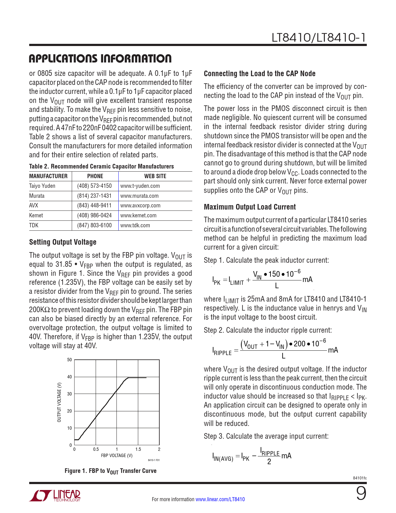 Kemet (408) 986-0424 www.kemet.com The maximum output current of a particular LT8410 series TDK (847) 803-6100 www.tdk.com circuit is a function of several circuit variables. The following
