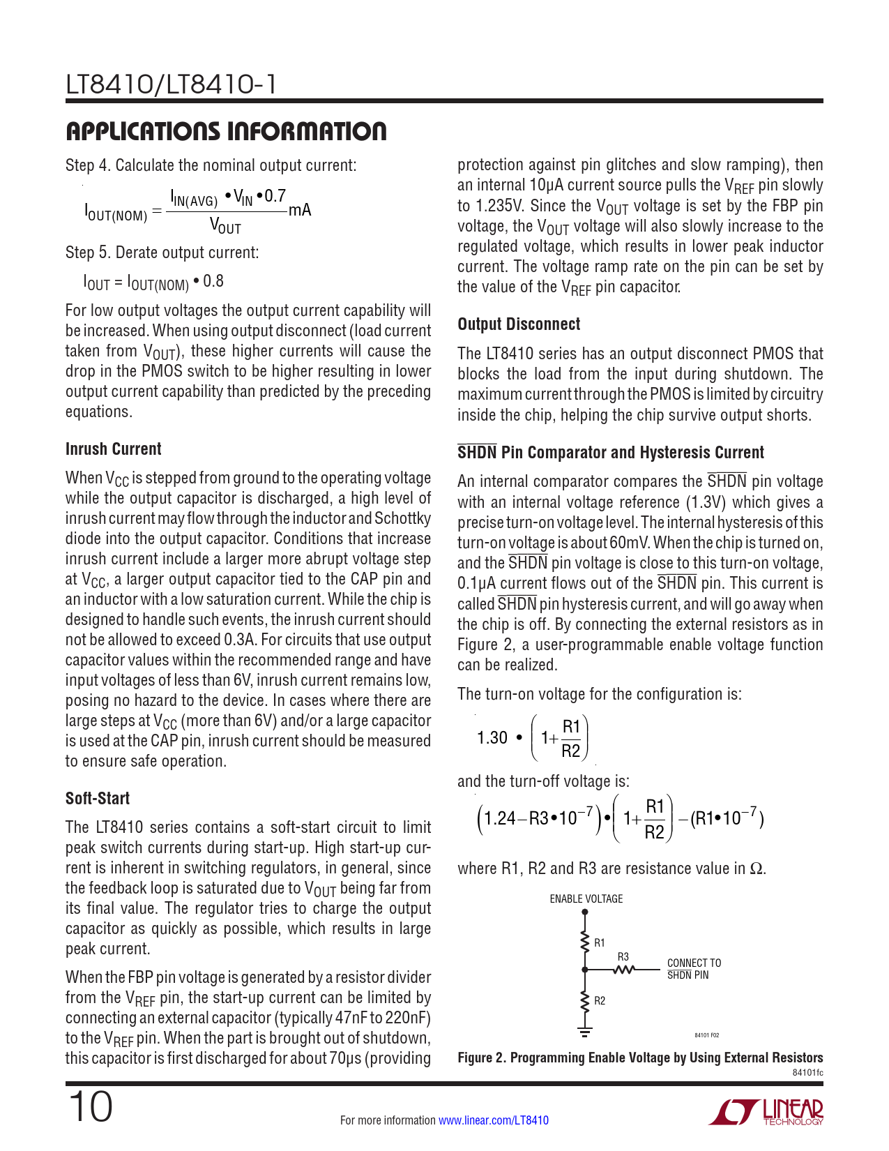 LT8410/LT8410-1 APPLICATIONS INFORMATION Step 4. Calculate the nominal output current: protection against pin glitches and slow ramping), then I an internal 10μA current source pulls the VREF pin slowly I IN(AVG) • VIN • 0.7 to 1.235V. Since the V OUT(NOM) = mA OUT voltage is set by the FBP pin VOUT voltage, the VOUT voltage will also slowly increase to the Step 5. Derate output current: regulated voltage, which results in lower peak inductor current. The voltage ramp rate on the pin can be set by IOUT = IOUT(NOM) • 0.8 the value of the VREF pin capacitor. For low output voltages the output current capability will be increased. When using output disconnect (load current Output Disconnect taken from VOUT), these higher currents will cause the The LT8410 series has an output disconnect PMOS that drop in the PMOS switch to be higher resulting in lower blocks the load from the input during shutdown. The output current capability than predicted by the preceding maximum current through the PMOS is limited by circuitry equations. inside the chip, helping the chip survive output shorts. Inrush CurrentSHDN Pin Comparator and Hysteresis Current When VCC is stepped from ground to the operating voltage An internal comparator compares the SHDN pin voltage while the output capacitor is discharged, a high level of with an internal voltage reference (1.3V) which gives a inrush current may flow through the inductor and Schottky precise turn-on voltage level. The internal hysteresis of this diode into the output capacitor. Conditions that increase turn-on voltage is about 60mV. When the chip is turned on, inrush current include a larger more abrupt voltage step and the SHDN pin voltage is close to this turn-on voltage, at VCC, a larger output capacitor tied to the CAP pin and 0.1μA current flows out of the SHDN pin. This current is an inductor with a low saturation current. While the chip is called SHDN pin hysteresis current, and will go away when designed to handle such events, the inrush current should the chip is off. By connecting the external resistors as in not be allowed to exceed 0.3A. For circuits that use output Figure 2, a user-programmable enable voltage function capacitor values within the recommended range and have can be realized. input voltages of less than 6V, inrush current remains low, posing no hazard to the device. In cases where there are The turn-on voltage for the configuration is: large steps at VCC (more than 6V) and/or a large capacitor is used at the CAP pin, inrush current should be measured 1.30 • 1+ R1 to ensure safe operation. R2 and the turn-off voltage is: Soft-Start The LT8410 series contains a soft-start circuit to limit 1.24−R3•10−7 ( )• 1+R1 −(R1•10−7) R2 peak switch currents during start-up. High start-up cur- rent is inherent in switching regulators, in general, since where R1, R2 and R3 are resistance value in Ω. the feedback loop is saturated due to VOUT being far from its final value. The regulator tries to charge the output ENABLE VOLTAGE capacitor as quickly as possible, which results in large peak current. R1 R3 CONNECT TO When the FBP pin voltage is generated by a resistor divider SHDN PIN from the VREF pin, the start-up current can be limited by R2 connecting an external capacitor (typically 47nF to 220nF) to the VREF pin. When the part is brought out of shutdown, 84101 F02 this capacitor is first discharged for about 70μs (providing Figure 2. Programming Enable Voltage by Using External Resistors 84101fc 10 For more information www.linear.com/LT8410 Document Outline Description Applications Description Typical Application Absolute Maximum Ratings Pin Configuration Order Information Electrical Characteristics Typical Performance Characteristics Features Pin Functions Block Diagram Operation Applications Information Typical Applications Package Description Revision History Typical Application Related Parts