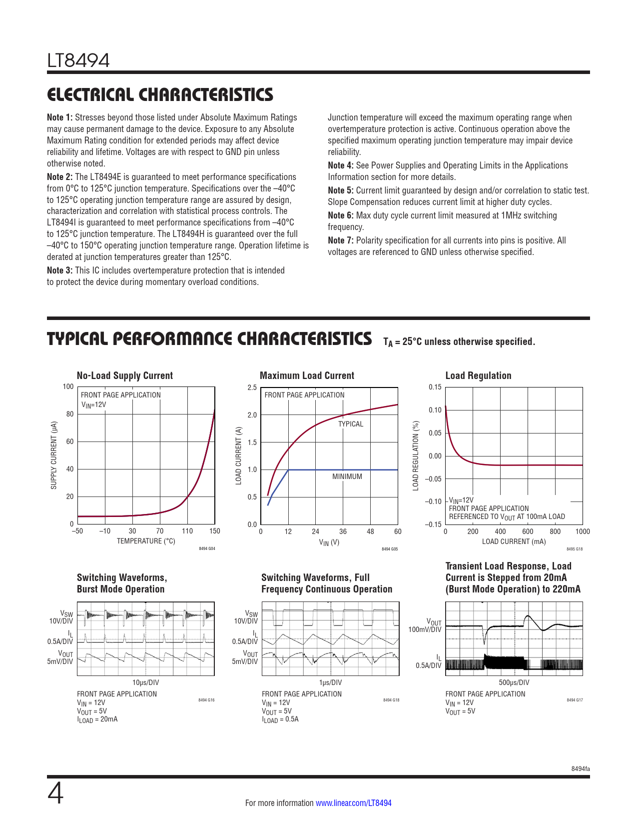 LT8494 ELECTRICAL CHARACTERISTICS Note 1: Stresses beyond those listed under Absolute Maximum Ratings Junction temperature will exceed the maximum operating range when may cause permanent damage to the device. Exposure to any Absolute overtemperature protection is active. Continuous operation above the Maximum Rating condition for extended periods may affect device specified maximum operating junction temperature may impair device reliability and lifetime. Voltages are with respect to GND pin unless reliability. otherwise noted. Note 4: See Power Supplies and Operating Limits in the Applications Note 2: The LT8494E is guaranteed to meet performance specifications Information section for more details. from 0°C to 125°C junction temperature. Specifications over the –40°C Note 5: Current limit guaranteed by design and/or correlation to static test. to 125°C operating junction temperature range are assured by design, Slope Compensation reduces current limit at higher duty cycles. characterization and correlation with statistical process controls. The Note 6: Max duty cycle current limit measured at 1MHz switching LT8494I is guaranteed to meet performance specifications from –40°C frequency. to 125°C junction temperature. The LT8494H is guaranteed over the full –40°C to 150°C operating junction temperature range. Operation lifetime is Note 7: Polarity specification for all currents into pins is positive. All derated at junction temperatures greater than 125°C. voltages are referenced to GND unless otherwise specified. Note 3: This IC includes overtemperature protection that is intended to protect the device during momentary overload conditions. TYPICAL PERFORMANCE CHARACTERISTICS TA = 25°C unless otherwise specified.No-Load Supply CurrentMaximum Load CurrentLoad Regulation 100 2.5 0.15 FRONT PAGE APPLICATION FRONT PAGE APPLICATION VIN=12V 80 0.10 2.0 TYPICAL 0.05 60 1.5 TION (%) 0.00 Y CURRENT (µA) 40 1.0 MINIMUM LOAD CURRENT (A) –0.05 SUPPL LOAD REGULA 20 0.5 –0.10 VIN=12V FRONT PAGE APPLICATION REFERENCED TO VOUT AT 100mA LOAD 0 0.0 –0.15 –50 –10 30 70 110 150 0 12 24 36 48 60 0 200 400 600 800 1000 TEMPERATURE (°C) VIN (V) LOAD CURRENT (mA) 8494 G04 8494 G05 8495 G18 Transient Load Response, LoadSwitching Waveforms,Switching Waveforms, FullCurrent is Stepped from 20mABurst Mode OperationFrequency Continuous Operation(Burst Mode Operation) to 220mA VSW VSW 10V/DIV 10V/DIV VOUT I 100mV/DIV L IL 0.5A/DIV 0.5A/DIV VOUT VOUT 5mV/DIV IL 5mV/DIV 0.5A/DIV 10µs/DIV 1µs/DIV 500µs/DIV FRONT PAGE APPLICATION FRONT PAGE APPLICATION FRONT PAGE APPLICATION V 8494 G16 8494 G18 8494 G17 IN = 12V VIN = 12V VIN = 12V VOUT = 5V VOUT = 5V VOUT = 5V ILOAD = 20mA ILOAD = 0.5A 8494fa 4 For more information www.linear.com/LT8494 Document Outline Features Applications Typical Application Description Absolute Maximum Ratings Pin Configuration Order Information Electrical Characteristics Typical Performance Characteristics Pin Functions Block Diagram Operation Applications Information Typical Application Related Parts