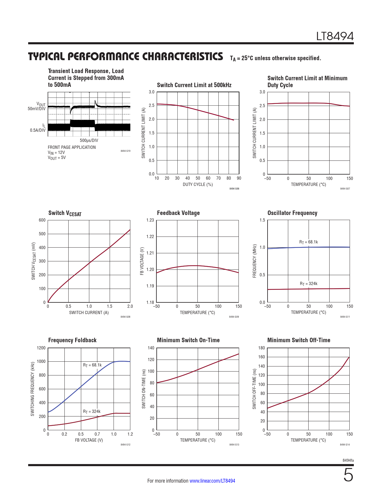 600 1.23 1.5 500 1.22 RT = 68.1k 400 1.0 (mV) T 1.21 CESA 300 TAGE (V) 1.20 200 FB VOL FREQUENCY (MHz) 0.5 SWITCH V RT = 324k 1.19 100 0 1.18 0.0 0 0.5 1.0 1.5 2.0 –50 0 50 100 150 –50 0 50 100 150 SWITCH CURRENT (A) TEMPERATURE (°C) TEMPERATURE (°C) 8494 G08 8494 G09 8494 G11