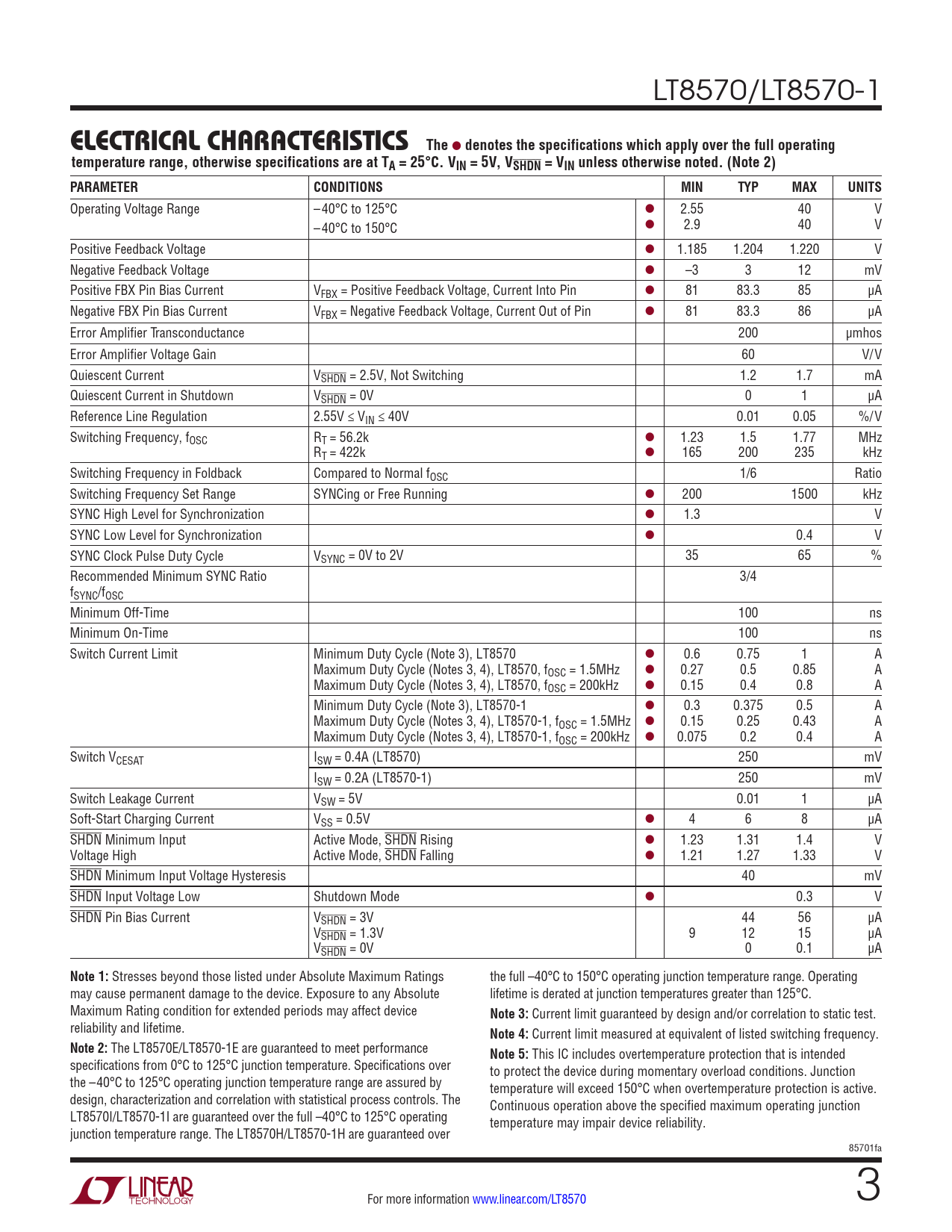 Operating Voltage Range –40°C to 125°C l 2.55 40 V –40°C to 150°C l 2.9 40 V Positive Feedback Voltage l 1.185 1.204 1.220 V Negative Feedback Voltage l –3 3 12 mV Positive FBX Pin Bias Current VFBX = Positive Feedback Voltage, Current Into Pin l 81 83.3 85 µA Negative FBX Pin Bias Current VFBX = Negative Feedback Voltage, Current Out of Pin l 81 83.3 86 µA Error Amplifier Transconductance 200 µmhos Error Amplifier Voltage Gain 60 V/V Quiescent Current VSHDN = 2.5V, Not Switching 1.2 1.7 mA Quiescent Current in Shutdown VSHDN = 0V 0 1 µA Reference Line Regulation 2.55V ≤ VIN ≤ 40V 0.01 0.05 %/V Switching Frequency, fOSC RT = 56.2k l 1.23 1.5 1.77 MHz RT = 422k l 165 200 235 kHz Switching Frequency in Foldback Compared to Normal fOSC 1/6 Ratio Switching Frequency Set Range SYNCing or Free Running l 200 1500 kHz SYNC High Level for Synchronization l 1.3 V SYNC Low Level for Synchronization l 0.4 V SYNC Clock Pulse Duty Cycle VSYNC = 0V to 2V 35 65 % Recommended Minimum SYNC Ratio 3/4 fSYNC/fOSC Minimum Off-Time 100 ns Minimum On-Time 100 ns Switch Current Limit Minimum Duty Cycle (Note 3), LT8570 l 0.6 0.75 1 A Maximum Duty Cycle (Notes 3, 4), LT8570, fOSC = 1.5MHz l 0.27 0.5 0.85 A Maximum Duty Cycle (Notes 3, 4), LT8570, fOSC = 200kHz l 0.15 0.4 0.8 A Minimum Duty Cycle (Note 3), LT8570-1 l 0.3 0.375 0.5 A Maximum Duty Cycle (Notes 3, 4), LT8570-1, fOSC = 1.5MHz l 0.15 0.25 0.43 A Maximum Duty Cycle (Notes 3, 4), LT8570-1, fOSC = 200kHz l 0.075 0.2 0.4 A Switch VCESAT ISW = 0.4A (LT8570) 250 mV ISW = 0.2A (LT8570-1) 250 mV Switch Leakage Current VSW = 5V 0.01 1 µA Soft-Start Charging Current VSS = 0.5V l 4 6 8 µA SHDN Minimum Input Active Mode, SHDN Rising l 1.23 1.31 1.4 V Voltage High Active Mode, SHDN Falling l 1.21 1.27 1.33 V SHDN Minimum Input Voltage Hysteresis 40 mV SHDN Input Voltage Low Shutdown Mode l 0.3 V SHDN Pin Bias Current VSHDN = 3V 44 56 µA VSHDN = 1.3V 9 12 15 µA VSHDN = 0V 0 0.1 µA