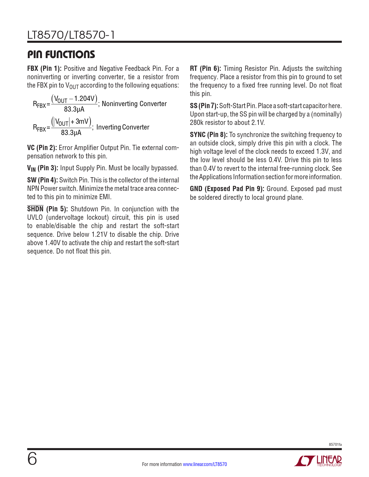 LT8570/LT8570-1 PIN FUNCTIONSFBX (Pin 1): Positive and Negative Feedback Pin. For a RT (Pin 6): Timing Resistor Pin. Adjusts the switching noninverting or inverting converter, tie a resistor from frequency. Place a resistor from this pin to ground to set the FBX pin to VOUT according to the following equations: the frequency to a fixed free running level. Do not float ( this pin. V ) R OUT − 1.204V FBX = ; Noninverting Converter 83.3µA SS (Pin 7): Soft-Start Pin. Place a soft-start capacitor here. ( Upon start-up, the SS pin will be charged by a (nominally) V ) 280k resistor to about 2.1V. R OUT + 3mV FBX = ; Inverting Converter 83.3µA SYNC (Pin 8): To synchronize the switching frequency to VC (Pin 2): Error Amplifier Output Pin. Tie external com- an outside clock, simply drive this pin with a clock. The pensation network to this pin. high voltage level of the clock needs to exceed 1.3V, and the low level should be less 0.4V. Drive this pin to less VIN (Pin 3): Input Supply Pin. Must be locally bypassed. than 0.4V to revert to the internal free-running clock. See SW (Pin 4): Switch Pin. This is the collector of the internal the Applications Information section for more information. NPN Power switch. Minimize the metal trace area connec- GND (Exposed Pad Pin 9): Ground. Exposed pad must ted to this pin to minimize EMI. be soldered directly to local ground plane. SHDN (Pin 5): Shutdown Pin. In conjunction with the UVLO (undervoltage lockout) circuit, this pin is used to enable/disable the chip and restart the soft-start sequence. Drive below 1.21V to disable the chip. Drive above 1.40V to activate the chip and restart the soft-start sequence. Do not float this pin. 85701fa 6 For more information www.linear.com/LT8570 Document Outline Features Applications Typical Application Description Absolute Maximum Ratings Pin Configuration Order Information Electrical Characteristics Typical Performance Characteristics Pin Functions Block Diagram Operation Applications Information Typical Applications Package Description Revision History Typical Application Related Parts