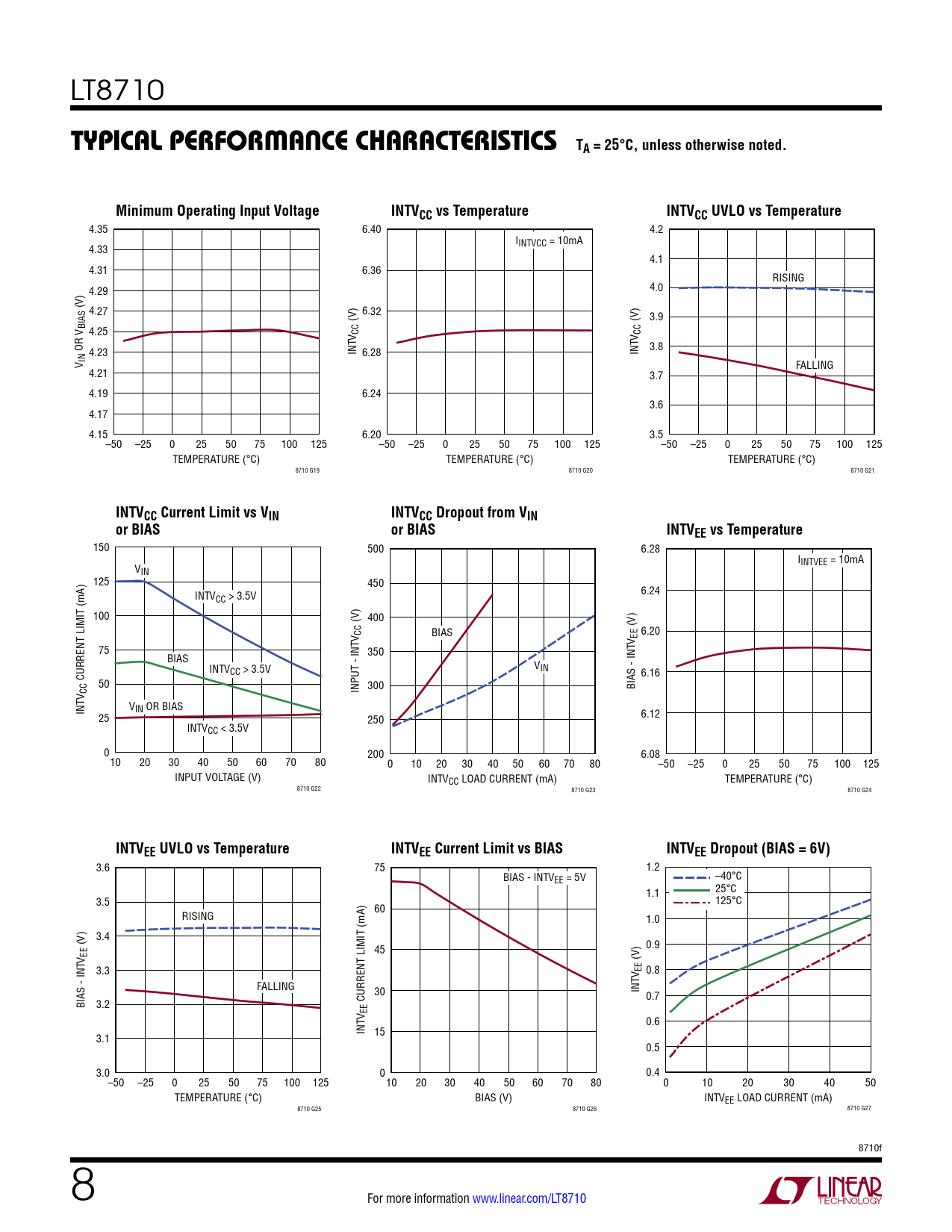 150 500 6.28 IINTVEE = 10mA VIN 125 450 INTV 6.24 CC > 3.5V 100 (V) 400 (V) V CC BIAS 6.20 V EE 75 BIAS 350 INTV V CC > 3.5V IN 6.16 CURRENT LIMIT (mA) 50 300 BIAS - INT V CC INPUT - INT INT VIN OR BIAS 25 250 6.12 INTVCC < 3.5V 0 200 6.08 10 20 30 40 50 60 70 80 0 10 20 30 40 50 60 70 80 –50 –25 0 25 50 75 100 125 INPUT VOLTAGE (V) INTVCC LOAD CURRENT (mA) TEMPERATURE (°C) 8710 G22 8710 G23 8710 G24