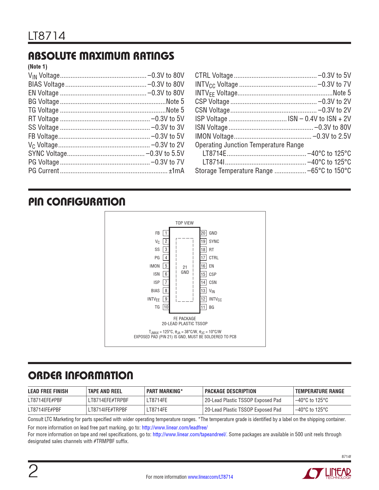 LT8714EFE#PBF LT8714EFE#TRPBF LT8714FE 20-Lead Plastic TSSOP Exposed Pad –40°C to 125°C LT8714IFE#PBF LT8714IFE#TRPBF LT8714FE 20-Lead Plastic TSSOP Exposed Pad –40°C to 125°C Consult LTC Marketing for parts specified with wider operating temperature ranges. *The temperature grade is identified by a label on the shipping container. For more information on lead free part marking, go to: http://www.linear.com/leadfree/ For more information on tape and reel specifications, go to: http://www.linear.com/tapeandreel/. Some packages are available in 500 unit reels through designated sales channels with #TRMPBF suffix. 8714f 2 For more information www.linear.com/LT8714 Document Outline Features Applications Typical Application Description Absolute Maximum Ratings Pin Configuration Order Information Electrical Characteristics Typical Performance Characteristics Pin Functions Block Diagram Operation Applications Information Appendix Typical Applications Package Description Typical Application Related Parts