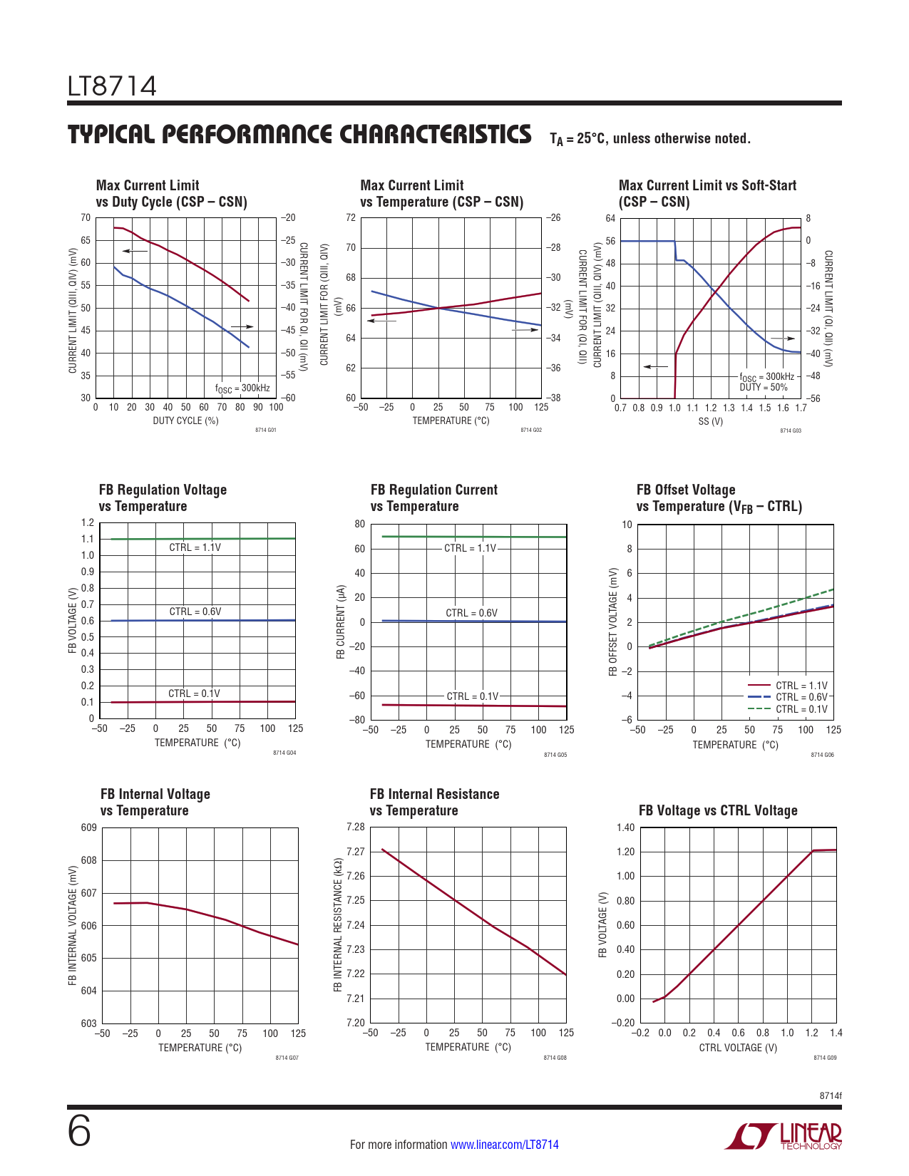 1.2 80 10 1.1 CTRL = 1.1V 60 CTRL = 1.1V 8 1.0 0.9 40 6 0.8 20 4 0.7 CTRL = 0.6V CTRL = 0.6V TAGE (mV) TAGE (V) 0.6 0 2 0.5 FB VOL –20 0 0.4 FB CURRENT (µA) 0.3 –40 FB OFFSET VOL –2 0.2 CTRL = 1.1V CTRL = 0.1V –60 –4 0.1 CTRL = 0.1V CTRL = 0.6V CTRL = 0.1V 0 –80 –6 –50 –25 0 25 50 75 100 125 –50 –25 0 25 50 75 100 125 –50 –25 0 25 50 75 100 125 TEMPERATURE (°C) TEMPERATURE (°C) TEMPERATURE (°C) 8714 G04 8714 G05 8714 G06