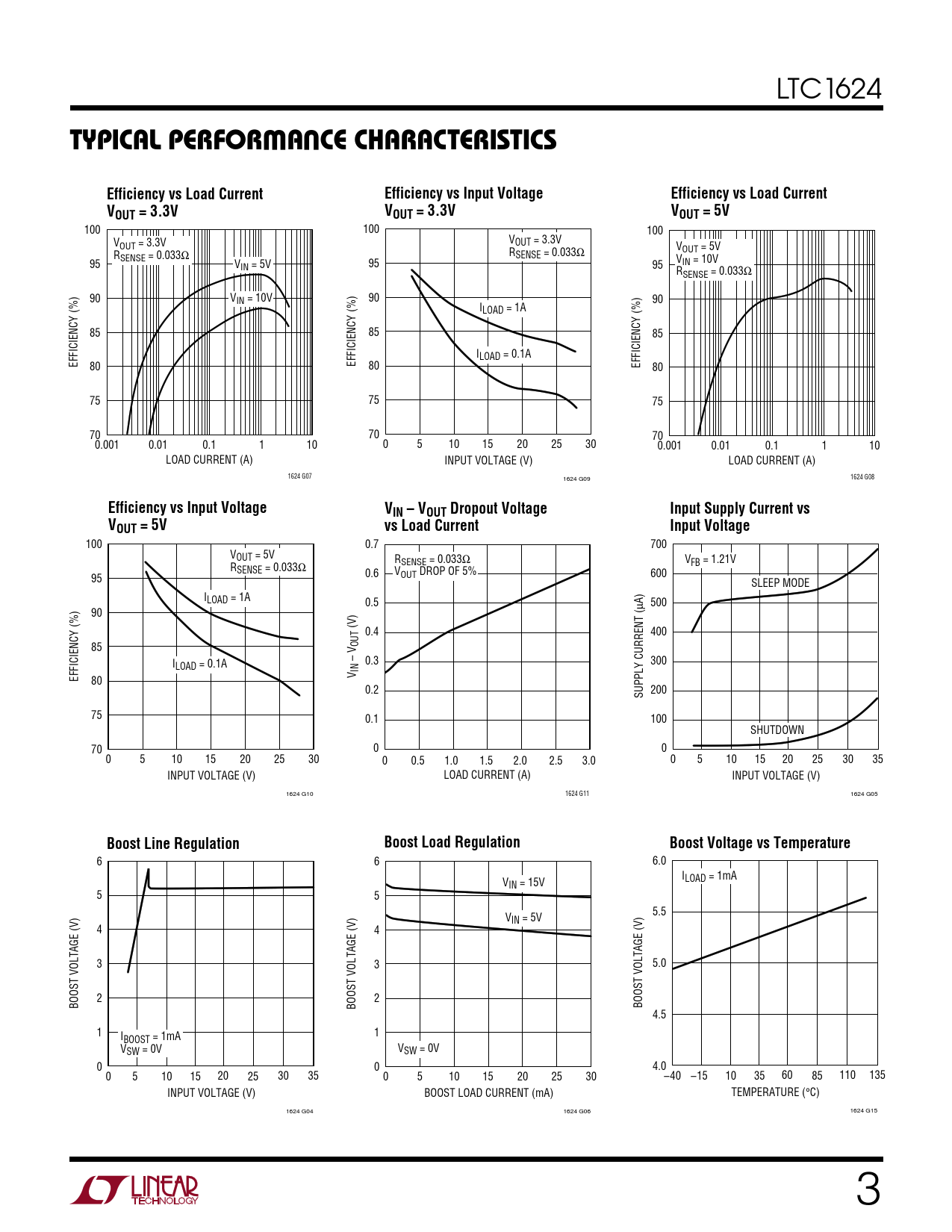 100 100 100 V V OUT = 3.3V OUT = 3.3V VOUT = 5V R R SENSE = 0.033Ω SENSE = 0.033Ω V 95 VIN = 5V 95 95 IN = 10V RSENSE = 0.033Ω 90 VIN = 10V 90 90 ILOAD = 1A 85 85 85 ILOAD = 0.1A EFFICIENCY (%) EFFICIENCY (%) EFFICIENCY (%) 80 80 80 75 75 75 70 70 70 0.001 0.01 0.1 1 10 0 5 10 15 20 25 30 0.001 0.01 0.1 1 10 LOAD CURRENT (A) INPUT VOLTAGE (V) LOAD CURRENT (A) 1624 G07 1624 G08 1624 G09