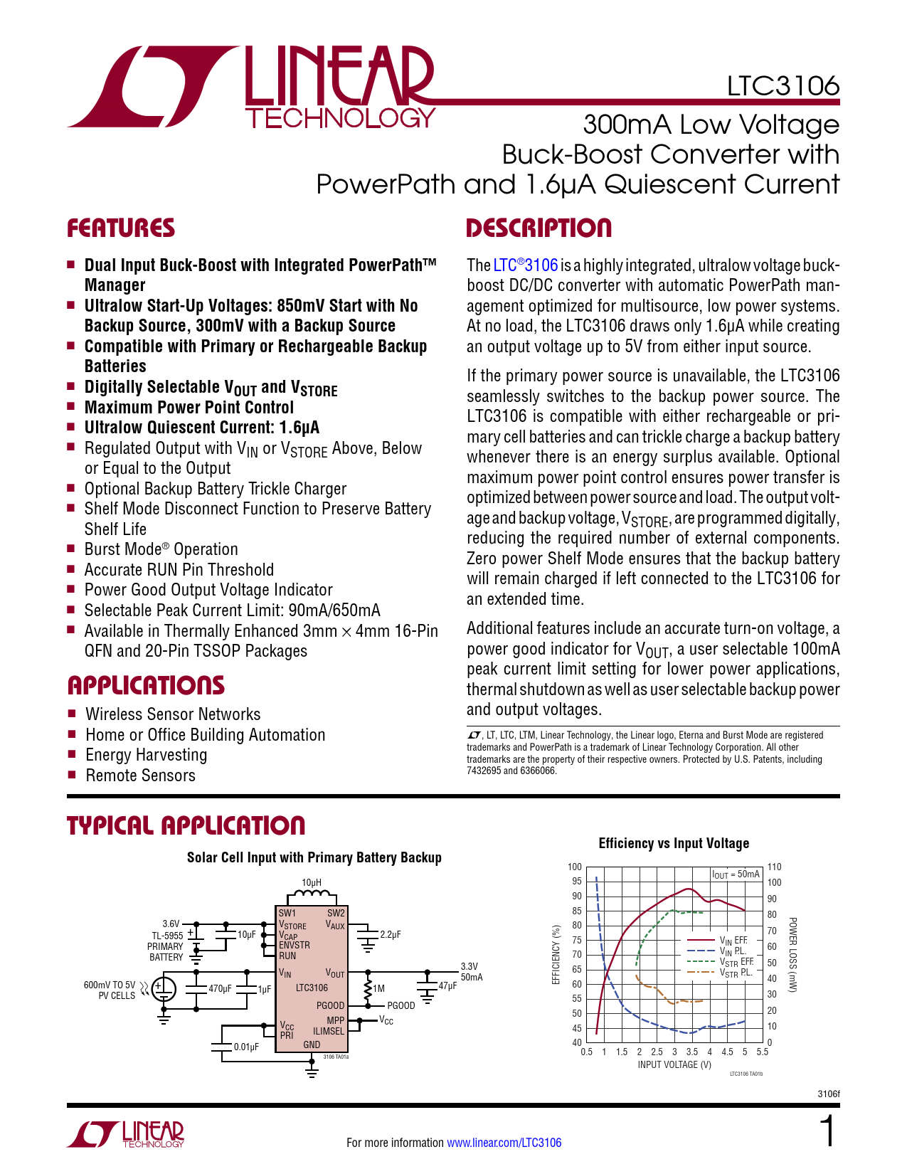 The LTC®3106 is a highly integrated, ultralow voltage buck-