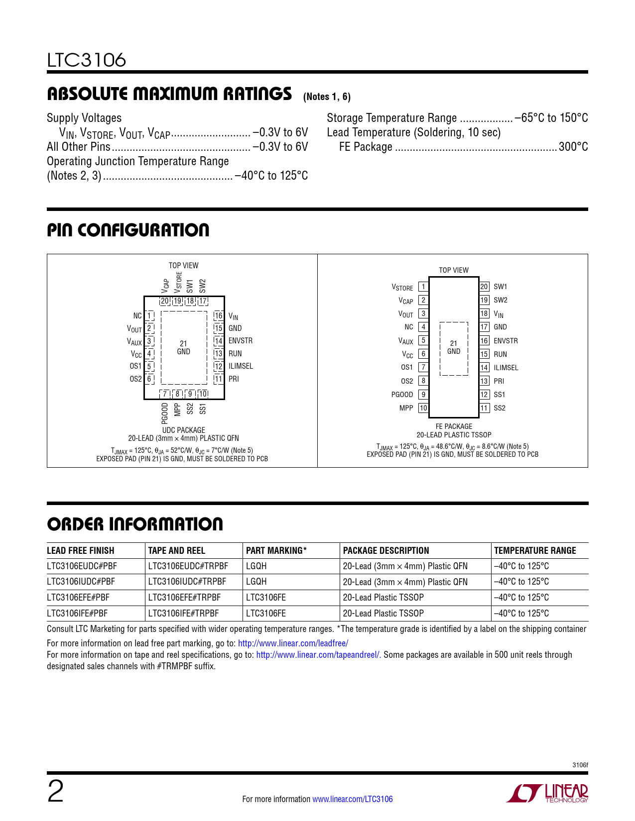 LTC3106 absoluTe MaxiMuM raTings (Notes 1, 6) Supply Voltages Storage Temperature Range .. –65°C to 150°C VIN, VSTORE, VOUT, VCAP ... –0.3V to 6V Lead Temperature (Soldering, 10 sec) Al Other Pins ... –0.3V to 6V FE Package ...300°C Operating Junction Temperature Range (Notes 2, 3) .. –40°C to 125°C pin conFiguraTion TOP VIEW TOP VIEW V CAP V STORE SW1 SW2 VSTORE 1 20 SW1 20 19 18 17 VCAP 2 19 SW2 NC 1 16 V VOUT 3 18 V IN IN VOUT 2 15 GND NC 4 17 GND VAUX 3 21 14 ENVSTR VAUX 5 16 ENVSTR 21 V GND CC 4 GND 13 RUN VCC 6 15 RUN OS1 5 12 ILIMSEL OS1 7 14 ILIMSEL OS2 6 11 PRI OS2 8 13 PRI 7 8 9 10 PGOOD 9 12 SS1 MPP 10 11 SS2 MPP SS2 SS1 PGOOD UDC PACKAGE FE PACKAGE 20-LEAD (3mm × 4mm) PLASTIC QFN 20-LEAD PLASTIC TSSOP T TJMAX = 125°C, θJA = 48.6°C/W, θJC = 8.6°C/W (Note 5) JMAX = 125°C, θJA = 52°C/W, θJC = 7°C/W (Note 5) EXPOSED PAD (PIN 21) IS GND, MUST BE SOLDERED TO PCB EXPOSED PAD (PIN 21) IS GND, MUST BE SOLDERED TO PCB orDer inForMaTion LEAD FREE FINISHTAPE AND REELPART MARKING*PACKAGE DESCRIPTIONTEMPERATURE RANGE LTC3106EUDC#PBF LTC3106EUDC#TRPBF LGQH 20-Lead (3mm × 4mm) Plastic QFN –40°C to 125°C LTC3106IUDC#PBF LTC3106IUDC#TRPBF LGQH 20-Lead (3mm × 4mm) Plastic QFN –40°C to 125°C LTC3106EFE#PBF LTC3106EFE#TRPBF LTC3106FE 20-Lead Plastic TSSOP –40°C to 125°C LTC3106IFE#PBF LTC3106IFE#TRPBF LTC3106FE 20-Lead Plastic TSSOP –40°C to 125°C Consult LTC Marketing for parts specified with wider operating temperature ranges. *The temperature grade is identified by a label on the shipping container For more information on lead free part marking, go to: http://www.linear.com/leadfree/ For more information on tape and reel specifications, go to: http://www.linear.com/tapeandreel/. Some packages are available in 500 unit reels through designated sales channels with #TRMPBF suffix. 3106f 2 For more information www.linear.com/LTC3106 Document Outline Features Applications Description Typical Application Absolute Maximum Ratings Pin Configuration Order Information Electrical Characteristics Typical Performance Characteristics Pin Functions Block Diagram Operation Applications Information Package Description Typical Application Related Parts