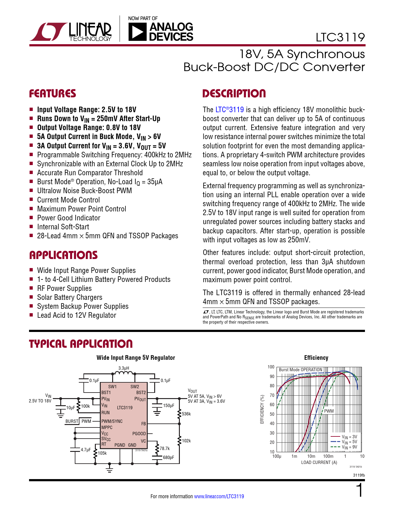 LTC3119 18V, 5A Synchronous Buck-Boost DC/DC Converter FeaTuresDescripTion n Input Voltage Range: 2.5V to 18V The LTC®3119 is a high efficiency 18V monolithic buck- n Runs Down to VIN = 250mV After Start-Up boost converter that can deliver up to 5A of continuous n Output Voltage Range: 0.8V to 18V output current. Extensive feature integration and very n 5A Output Current in Buck Mode, VIN > 6V low resistance internal power switches minimize the total n 3A Output Current for VIN = 3.6V, VOUT = 5V solution footprint for even the most demanding applica- n Programmable Switching Frequency: 400kHz to 2MHz tions. A proprietary 4-switch PWM architecture provides n Synchronizable with an External Clock Up to 2MHz seamless low noise operation from input voltages above, n Accurate Run Comparator Threshold equal to, or below the output voltage. n Burst Mode® Operation, No-Load IQ = 35µA External frequency programming as well as synchroniza- n Ultralow Noise Buck-Boost PWM tion using an internal PLL enable operation over a wide n Current Mode Control switching frequency range of 400kHz to 2MHz. The wide n Maximum Power Point Control 2.5V to 18V input range is well suited for operation from n Power Good Indicator unregulated power sources including battery stacks and n Internal Soft-Start backup capacitors. After start-up, operation is possible n 28-Lead 4mm × 5mm QFN and TSSOP Packages with input voltages as low as 250mV. Other features include: output short-circuit protection, applicaTions thermal overload protection, less than 3µA shutdown n Wide Input Range Power Supplies current, power good indicator, Burst Mode operation, and n 1- to 4-Cell Lithium Battery Powered Products maximum power point control. n RF Power Supplies The LTC3119 is offered in thermally enhanced 28-lead n Solar Battery Chargers 4mm × 5mm QFN and TSSOP packages. n System Backup Power Supplies n Lead Acid to 12V Regulator L, LT, LTC, LTM, Linear Technology, the Linear logo and Burst Mode are registered trademarks and PowerPath and No RSENSE are trademarks of Analog Devices, Inc. All other trademarks are the property of their respective owners. Typical applicaTionWide Input Range 5V RegulatorEfficiencyEfficiency 3.3µH 100 Burst Mode OPERATION 90 0.1µF 0.1µF SW1 SW2 80 BST1 BST2 VOUT VIN 70 PV 5V AT 5A, VIN > 6V IN PVOUT 2.5V TO 18V 5V AT 3A, VIN = 3.6V 60 10µF 100k VIN 150µF LTC3119 RUN 536k PWM 50 BURST PWM PWM/SYNC FB EFFICIENCY (%) 40 MPPC VCC PGOOD 30 SV V CC IN = 3V VC 102k RT 20 V PGND GND IN = 5V 4.7µF 78.7k VIN = 9V 105k 3119 TA01a 10 680pF 100μ 1m 10m 100m 1 10 LOAD CURRENT (A) 3119 TA01b 3119fb For more information www.linear.com/LTC3119 1 Document Outline Features Applications Typical Application Description Absolute Maximum Ratings Pin Configuration Order Information Electrical Characteristics Typical Performance Characteristics Pin Functions Block Diagram Operation Introduction PWM Mode Operation VCC Regulator Current Mode Control Error Amplifiers Current Limit and Zero Current Detection Soft-Start Maximum Power Point Control (MPPC) Burst Mode Operation Power Good Indicator Thermal Considerations Applications Information Typical Applications Package Description Revision History Typical Application Related Parts