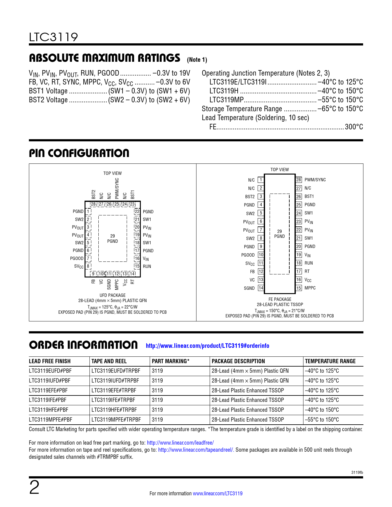 VIN, PVIN, PVOUT, RUN, PGOOD ... –0.3V to 19V Operating Junction Temperature (Notes 2, 3) FB, VC, RT, SYNC, MPPC, VCC, SVCC ... –0.3V to 6V LTC3119E/LTC3119I ... –40°C to 125°C BST1 Voltage ...(SW1 – 0.3V) to (SW1 + 6V) LTC3119H .. –40°C to 150°C BST2 Voltage ...(SW2 – 0.3V) to (SW2 + 6V) LTC3119MP.. –55°C to 150°C Storage Temperature Range .. –65°C to 150°C Lead Temperature (Soldering, 10 sec) FE..300°C
