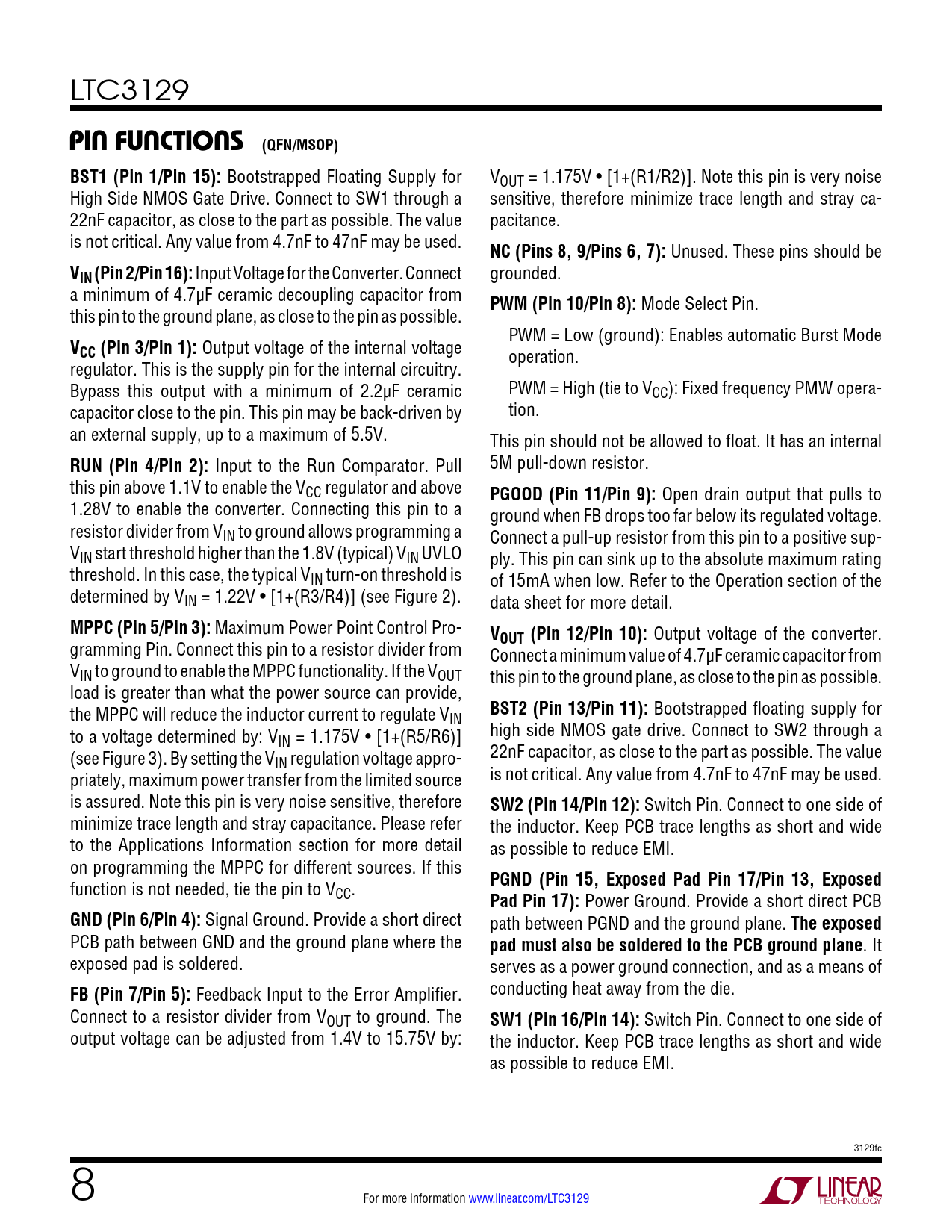 pin FuncTions (QFN/MSOP). BST1 (Pin 1/Pin 15):. NC (Pins 8, 9/Pins 6, 7):. VIN (Pin 2/Pin 16):. PWM (Pin 10/Pin 8):