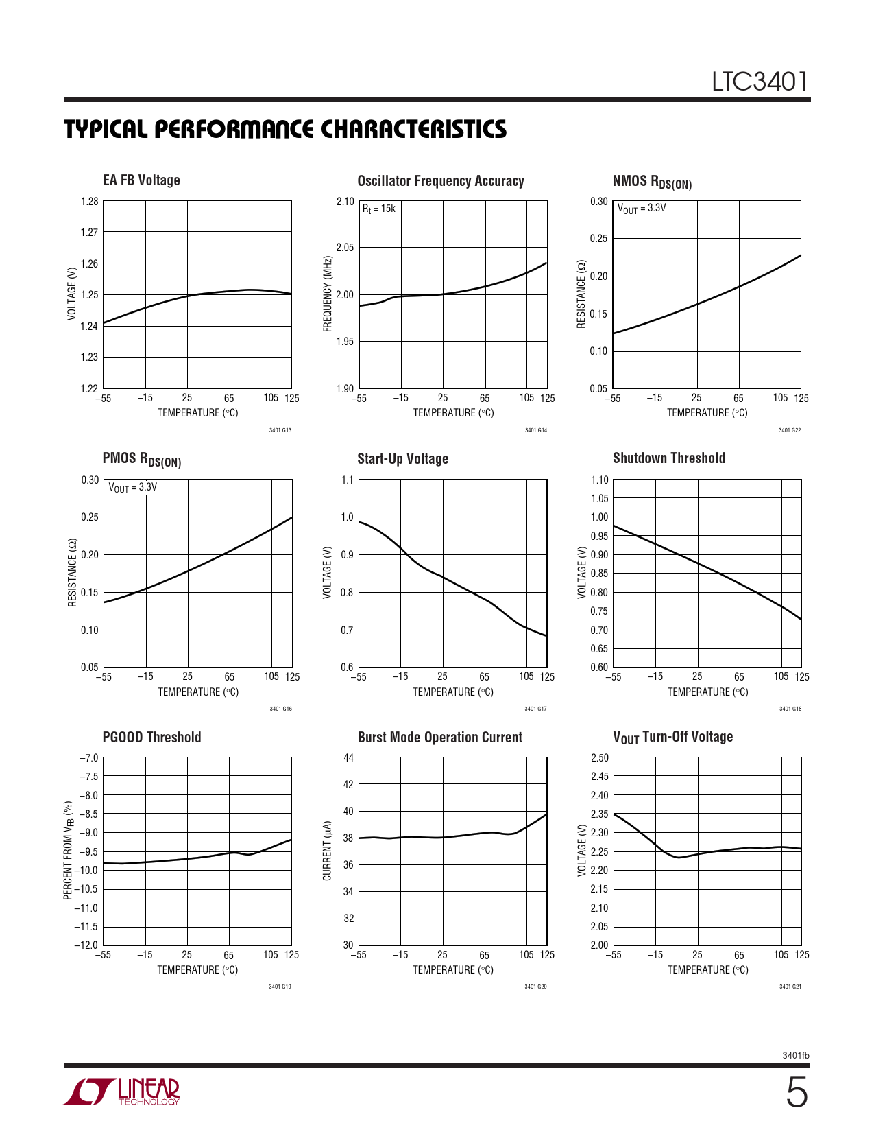 0.30 1.1 1.10 VOUT = 3.3V 1.05 0.25 1.0 1.00 ) 0.95 Ω 0.20 0.9 0.90 0.85 0.15 VOLTAGE (V) 0.8 VOLTAGE (V) 0.80 RESISTANCE ( 0.75 0.10 0.7 0.70 0.65 0.05 0.6 0.60 –55 –15 25 65 105 125 –55 –15 25 65 105 125 –55 –15 25 65 105 125 TEMPERATURE (°C) TEMPERATURE (°C) TEMPERATURE (°C) 3401 G16 3401 G17 3401 G18