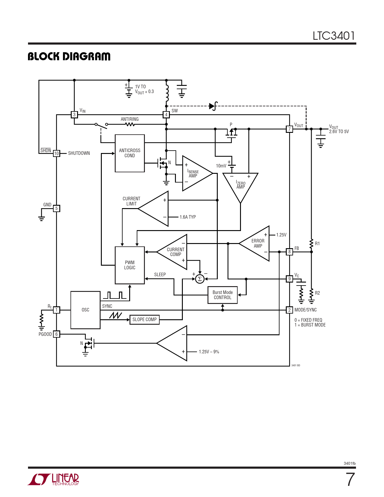 + 1V TO VOUT + 0.3 VIN SW 3 4 ANTIRING P VOUT VOUT 7 2.6V TO 5V SHDN ANTICROSS 10 SHUTDOWN COND N + + 10mV ISENSE AMP – + – IZERO AMP + CURRENT LIMIT GND 5 – 1.6A TYP + 1.25V – ERROR R1 AMP CURRENT – FB 8 COMP + PWM LOGIC SLEEP + – Σ VC 9 Burst Mode R2 CONTROL R SYNC t 1 OSC 2 MODE/SYNC SLOPE COMP 0 = FIXED FREQ 1 = BURST MODE – PGOOD 6 N + 1.25V – 9% 3401 BD 3401fb 7