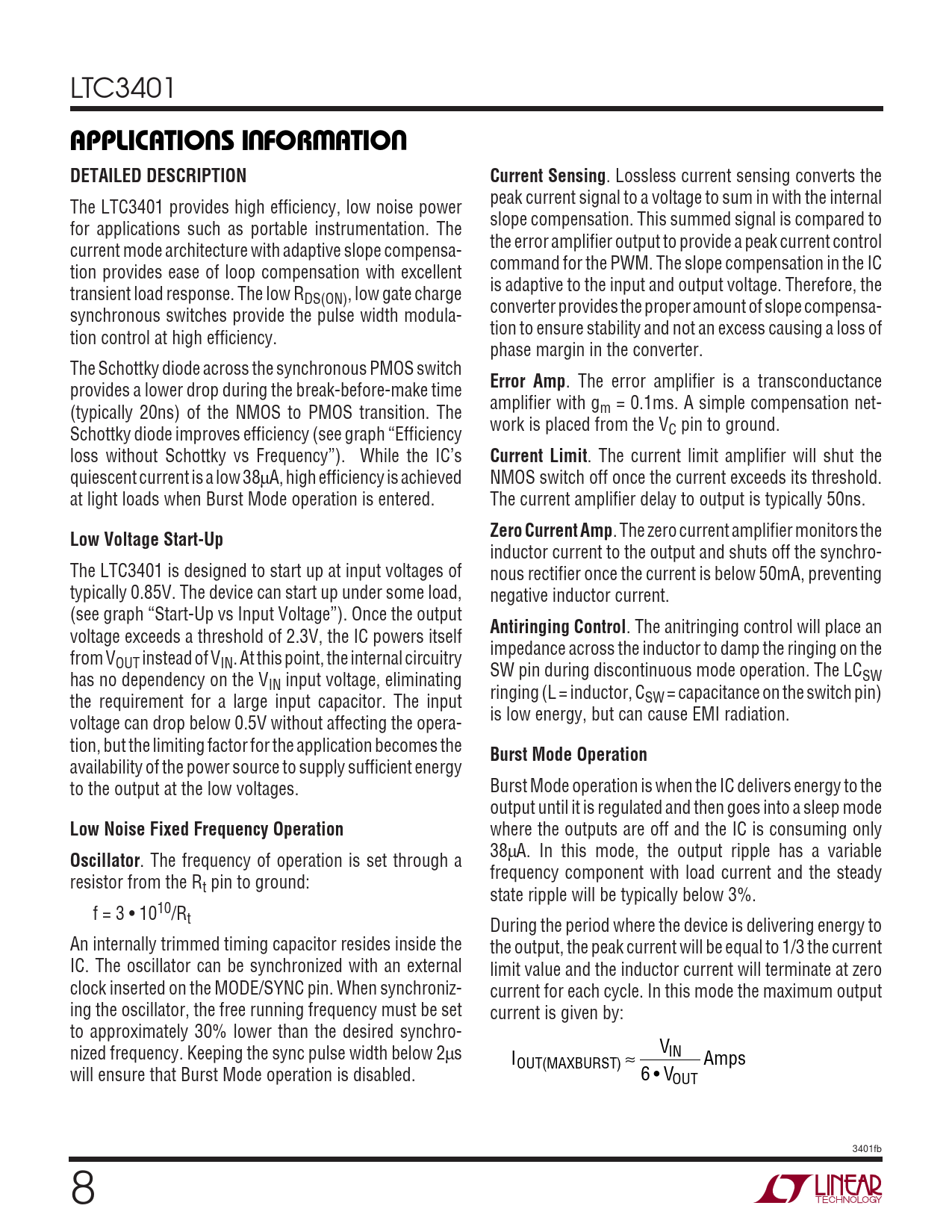 . The frequency of operation is set through a frequency component with load current and the steady resistor from the Rt pin to ground: state ripple will be typically below 3%. f = 3 • 1010/Rt During the period where the device is delivering energy to An internally trimmed timing capacitor resides inside the the output, the peak current will be equal to 1/3 the current IC. The oscillator can be synchronized with an external limit value and the inductor current will terminate at zero clock inserted on the MODE/SYNC pin. When synchroniz- current for each cycle. In this mode the maximum output ing the oscillator, the free running frequency must be set current is given by: to approximately 30% lower than the desired synchro- V nized frequency. Keeping the sync pulse width below 2μs I IN ≈ Amps OUT MAXBURST ( ) will ensure that Burst Mode operation is disabled. 6 • VOUT 3401fb 8