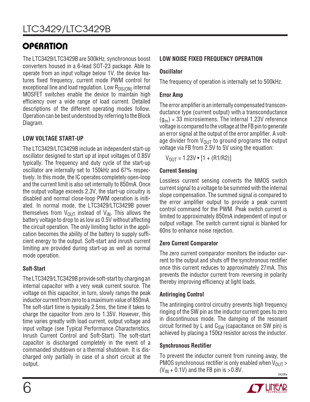 once this current reduces to approximately 27mA. This prevents the inductor current from reversing in polarity The LTC3429/LTC3429B provide soft-start by charging an thereby improving efficiency at light loads. internal capacitor with a very weak current source. The voltage on this capacitor, in turn, slowly ramps the peak