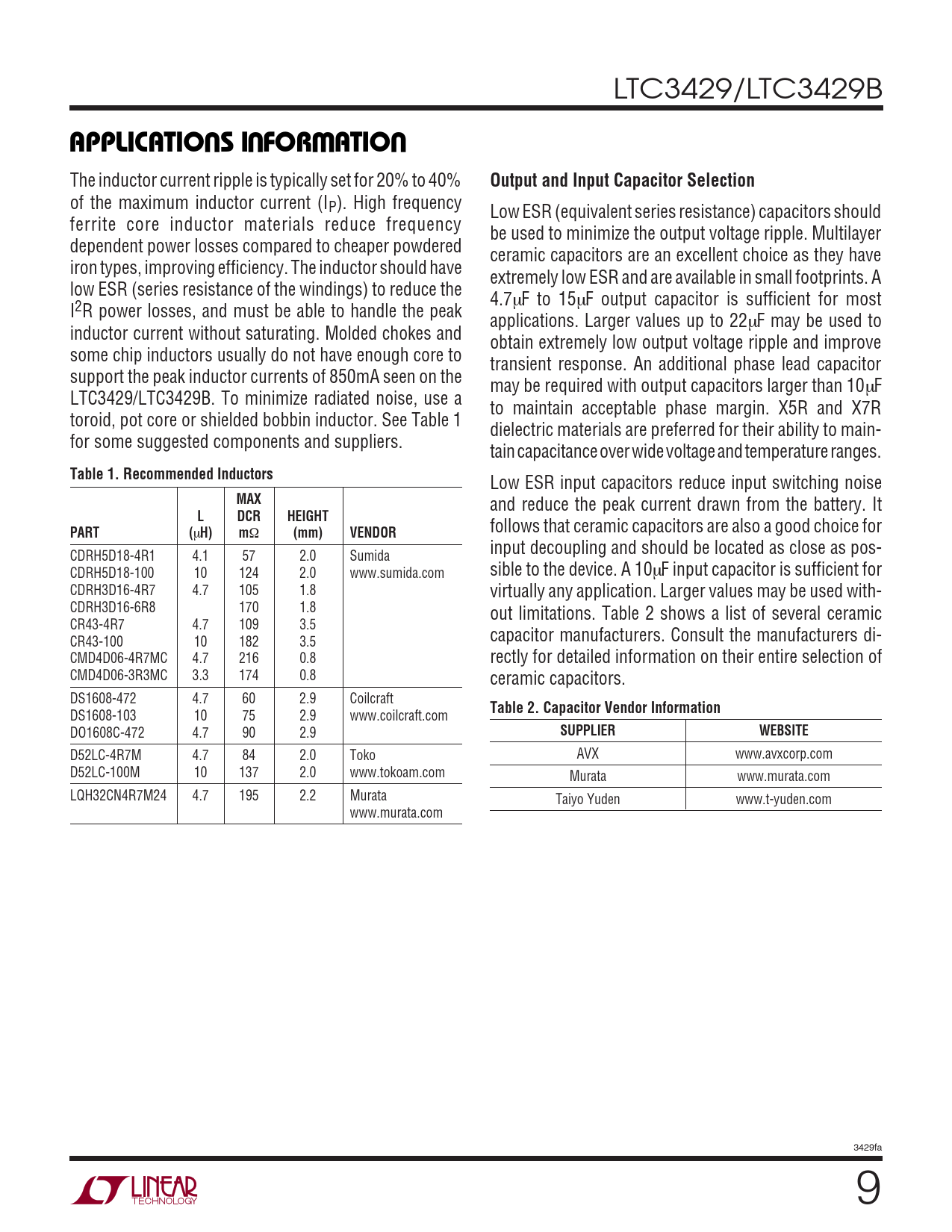 D52LC-4R7M 4.7 84 2.0 Toko AVX www.avxcorp.com D52LC-100M 10 137 2.0 www.tokoam.com Murata www.murata.com LQH32CN4R7M24 4.7 195 2.2 Murata Taiyo Yuden www.t-yuden.com www.murata.com 3429fa 9