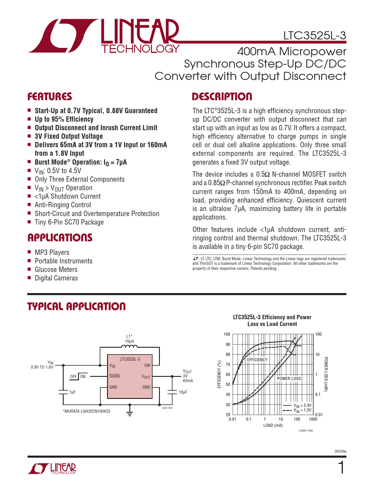 ringing control and thermal shutdown. The LTC3525L-3 is available in a tiny 6-pin SC70 package. n MP3 Players L, LT, LTC, LTM, Burst Mode, Linear Technology and the Linear logo are registered trademarks n Portable Instruments and ThinSOT is a trademark of Linear Technology Corporation. All other trademarks are the n Glucose Meters property of their respective owners. Patents pending. n Digital Cameras