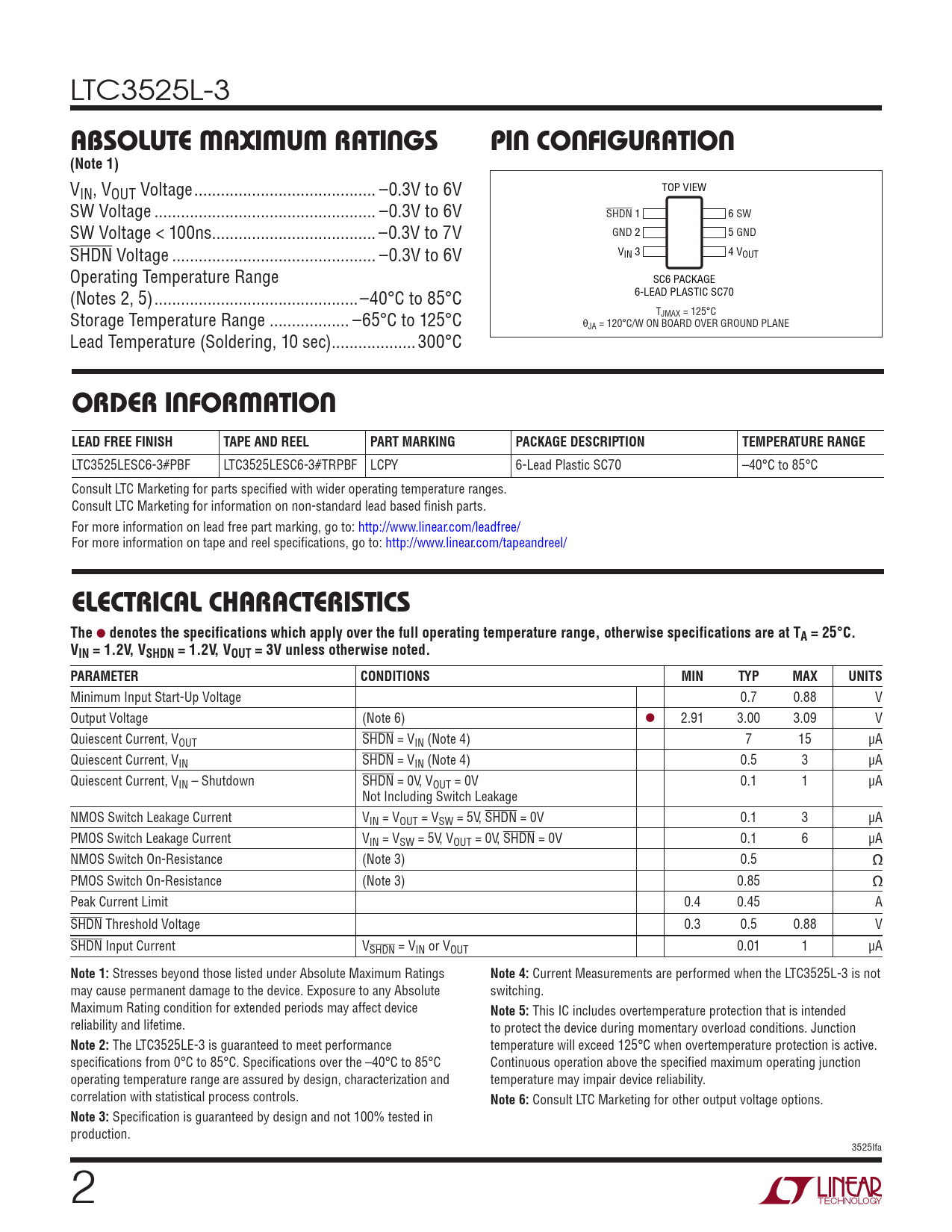LTC3525L-3 ABSOLUTE MAXIMUM RATINGSPIN CONFIGURATION(Note 1) VIN, VOUT Voltage ... –0.3V to 6V TOP VIEW SW Voltage .. –0.3V to 6V SHDN 1 6 SW SW Voltage < 100ns ... –0.3V to 7V GND 2 5 GND SHDN Voltage .. –0.3V to 6V VIN 3 4 VOUT Operating Temperature Range SC6 PACKAGE (Notes 2, 5) ..–40°C to 85°C 6-LEAD PLASTIC SC70 Storage Temperature Range .. –65°C to 125°C TJMAX = 125°C θJA = 120°C/W ON BOARD OVER GROUND PLANE Lead Temperature (Soldering, 10 sec) ...300°C ORDER INFORMATION LEAD FREE FINISHTAPE AND REELPART MARKINGPACKAGE DESCRIPTIONTEMPERATURE RANGE LTC3525LESC6-3#PBF LTC3525LESC6-3#TRPBF LCPY 6-Lead Plastic SC70 –40°C to 85°C Consult LTC Marketing for parts specified with wider operating temperature ranges. Consult LTC Marketing for information on non-standard lead based finish parts. For more information on lead free part marking, go to: http://www.linear.com/leadfree/ For more information on tape and reel specifications, go to: http://www.linear.com/tapeandreel/ ELECTRICAL CHARACTERISTICSThe l denotes the specifications which apply over the full operating temperature range, otherwise specifications are at TA = 25°C.VIN = 1.2V, VSHDN = 1.2V, VOUT = 3V unless otherwise noted. PARAMETERCONDITIONSMINTYPMAXUNITS Minimum Input Start-Up Voltage 0.7 0.88 V Output Voltage (Note 6) l 2.91 3.00 3.09 V Quiescent Current, VOUT SHDN = VIN (Note 4) 7 15 µA Quiescent Current, VIN SHDN = VIN (Note 4) 0.5 3 µA Quiescent Current, VIN – Shutdown SHDN = 0V, VOUT = 0V 0.1 1 µA Not Including Switch Leakage NMOS Switch Leakage Current VIN = VOUT = VSW = 5V, SHDN = 0V 0.1 3 µA PMOS Switch Leakage Current VIN = VSW = 5V, VOUT = 0V, SHDN = 0V 0.1 6 µA NMOS Switch On-Resistance (Note 3) 0.5 PMOS Switch On-Resistance (Note 3) 0.85 Peak Current Limit 0.4 0.45 A SHDN Threshold Voltage 0.3 0.5 0.88 V SHDN Input Current VSHDN = VIN or VOUT 0.01 1 µA Note 1: Stresses beyond those listed under Absolute Maximum Ratings Note 4: Current Measurements are performed when the LTC3525L-3 is not may cause permanent damage to the device. Exposure to any Absolute switching. Maximum Rating condition for extended periods may affect device Note 5: This IC includes overtemperature protection that is intended reliability and lifetime. to protect the device during momentary overload conditions. Junction Note 2: The LTC3525LE-3 is guaranteed to meet performance temperature will exceed 125°C when overtemperature protection is active. specifications from 0°C to 85°C. Specifications over the –40°C to 85°C Continuous operation above the specified maximum operating junction operating temperature range are assured by design, characterization and temperature may impair device reliability. correlation with statistical process controls. Note 6: Consult LTC Marketing for other output voltage options. Note 3: Specification is guaranteed by design and not 100% tested in production. 3525lfa 2 Document Outline Features Applications Description Typical Application Absolute Maximum Ratings Pin Configuration Order Information Electrical Characteristics Typical Performance Characteristics Pin Functions Block Diagram Operation Package Description Revision History Typical Applications Related Parts