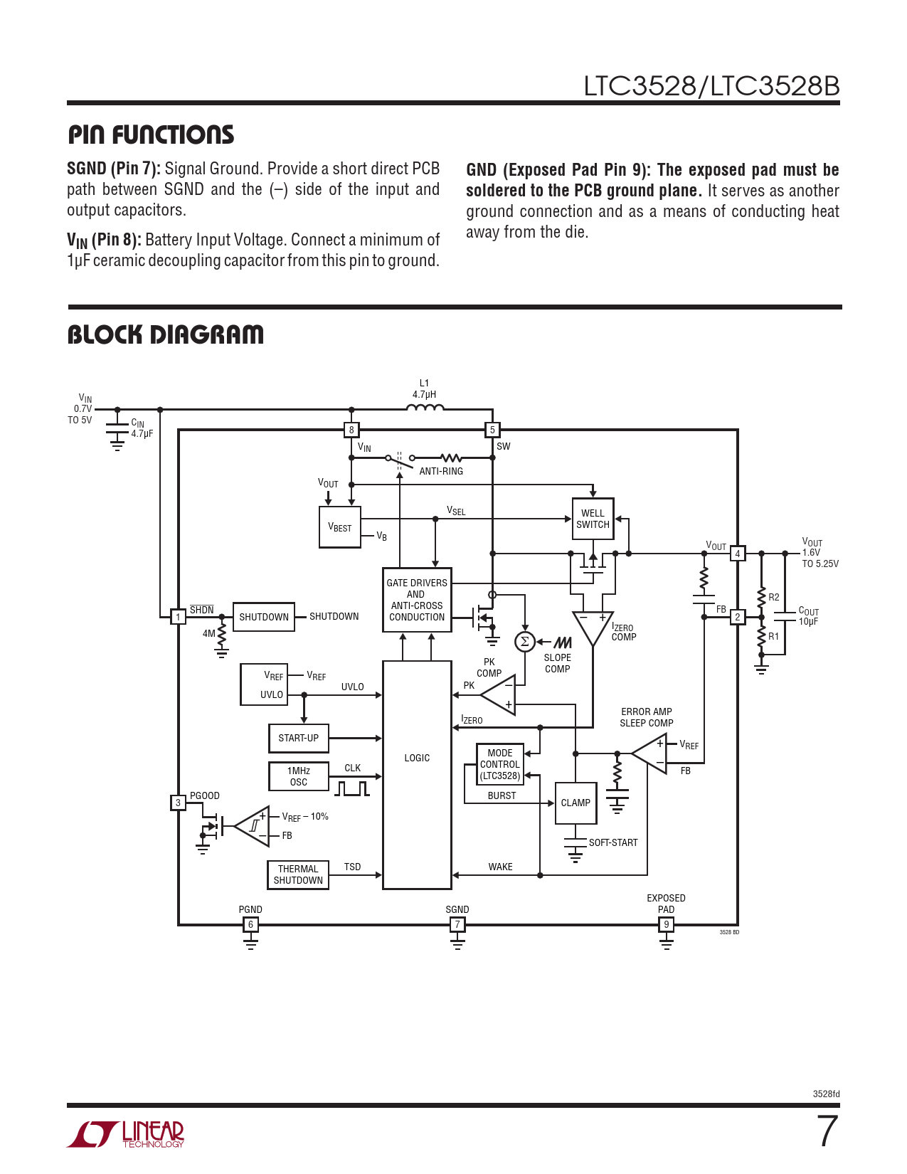 LTC3528/LTC3528B PIN FUNCTIONSSGND (Pin 7): Signal Ground. Provide a short direct PCB GND (Exposed Pad Pin 9):The exposed pad must be path between SGND and the (–) side of the input and soldered to the PCB ground plane. It serves as another output capacitors. ground connection and as a means of conducting heat V away from the die. IN (Pin 8): Battery Input Voltage. Connect a minimum of 1µF ceramic decoupling capacitor from this pin to ground. BLOCK DIAGRAM L1 4.7µH VIN 0.7V TO 5V CIN 8 5 4.7µF VIN SW ANTI-RING VOUT VSEL WELL V SWITCH BEST VB V V OUT OUT 4 1.6V TO 5.25V GATE DRIVERS AND R2 ANTI-CROSS SHDN FB C 1 SHUTDOWN SHUTDOWN CONDUCTION – + 2 OUT I 10µF ZERO 4M Σ COMP R1 PK SLOPE V COMP REF VREF – COMP UVLO PK UVLO + ERROR AMP IZERO SLEEP COMP START-UP + VREF LOGIC MODE CONTROL – 1MHz CLK (LTC3528) FB OSC PGOOD BURST 3 CLAMP + VREF – 10% – FB SOFT-START THERMAL TSD WAKE SHUTDOWN EXPOSED PGND SGND PAD 6 7 9 3528 BD 3528fd 7 Document Outline Features Applications Description Typical Application Absolute Maximum Ratings Pin Configuration order information Electrical Characteristics Typical Performance Characteristics Pin Functions Block Diagram Operation Applications Information Typical Applications Package Description Revision History Related Parts