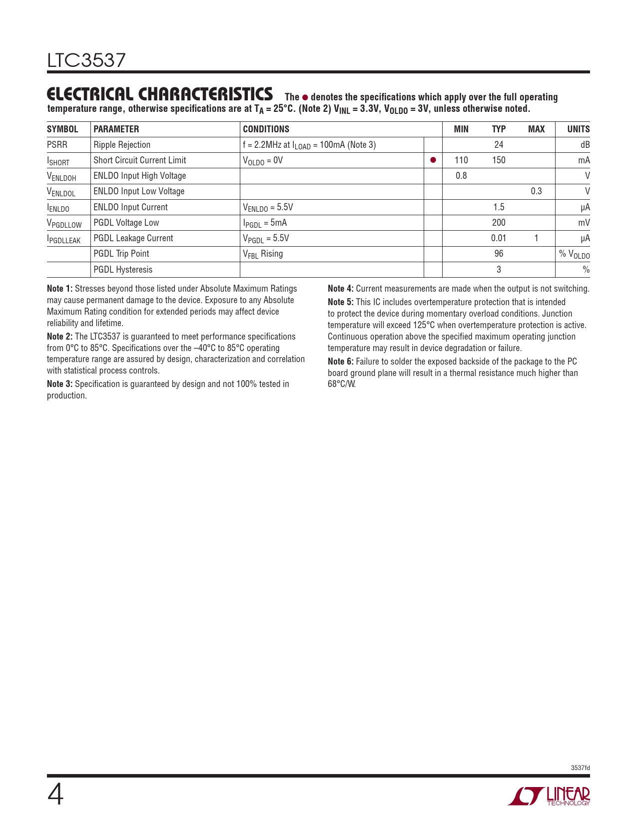 Specifi cation is guaranteed by design and not 100% tested in 68°C/W. production. 3537fd 4