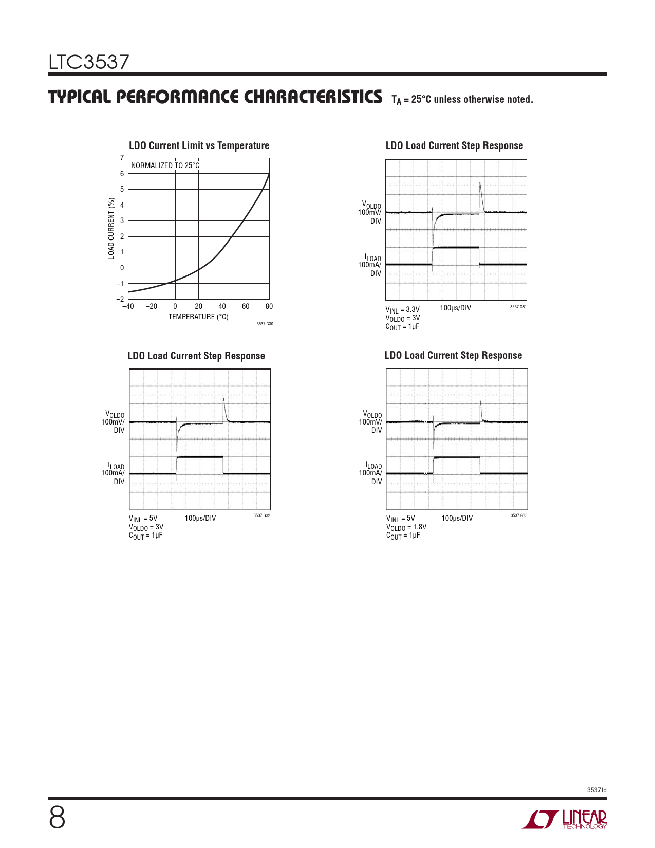 7 NORMALIZED TO 25°C 6 5 4 VOLDO 100mV/ 3 DIV 2 1 LOAD CURRENT (%) ILOAD 100mA/ 0 DIV –1 –2–40 –20 0 20 40 60 80 V 3537 G31 INL = 3.3V 100μs/DIV TEMPERATURE (°C) VOLDO = 3V 3537 G30 COUT = 1μF