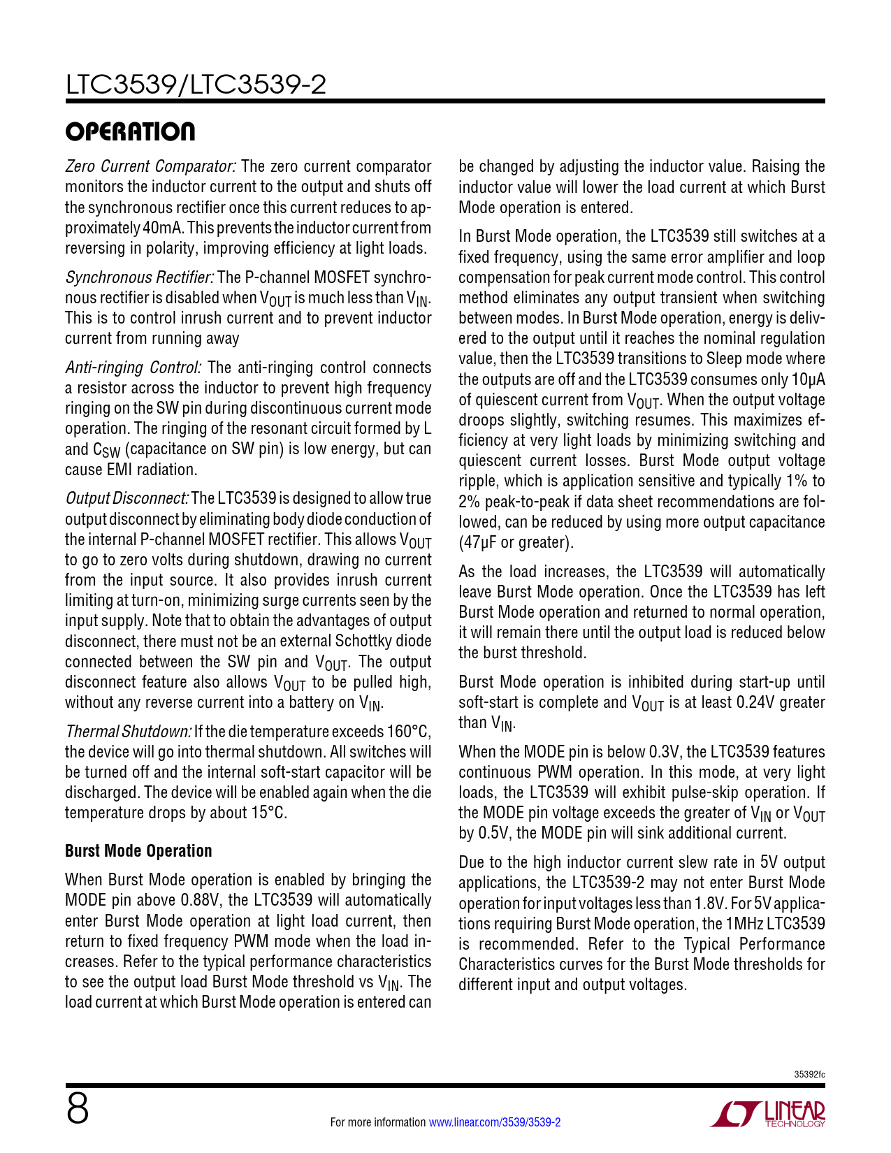 Zero Current Comparator: The zero current comparator be changed by adjusting the inductor value. Raising the monitors the inductor current to the output and shuts off inductor value will lower the load current at which Burst the synchronous rectifier once this current reduces to ap- Mode operation is entered. proximately 40mA. This prevents the inductor current from In Burst Mode operation, the LTC3539 still switches at a reversing in polarity, improving efficiency at light loads. fixed frequency, using the same error amplifier and loop Synchronous Rectifier: The P-channel MOSFET synchro- compensation for peak current mode control. This control nous rectifier is disabled when VOUT is much less than VIN. method eliminates any output transient when switching This is to control inrush current and to prevent inductor between modes. In Burst Mode operation, energy is deliv- current from running away ered to the output until it reaches the nominal regulation Anti-ringing Control: The anti-ringing control connects value, then the LTC3539 transitions to Sleep mode where a resistor across the inductor to prevent high frequency the outputs are off and the LTC3539 consumes only 10µA ringing on the SW pin during discontinuous current mode of quiescent current from VOUT. When the output voltage operation. The ringing of the resonant circuit formed by L droops slightly, switching resumes. This maximizes ef- and C ficiency at very light loads by minimizing switching and SW (capacitance on SW pin) is low energy, but can cause EMI radiation. quiescent current losses. Burst Mode output voltage ripple, which is application sensitive and typically 1% to Output Disconnect: The LTC3539 is designed to allow true 2% peak-to-peak if data sheet recommendations are fol- output disconnect by eliminating body diode conduction of lowed, can be reduced by using more output capacitance the internal P-channel MOSFET rectifier. This allows VOUT (47µF or greater). to go to zero volts during shutdown, drawing no current from the input source. It also provides inrush current As the load increases, the LTC3539 will automatically limiting at turn-on, minimizing surge currents seen by the leave Burst Mode operation. Once the LTC3539 has left input supply. Note that to obtain the advantages of output Burst Mode operation and returned to normal operation, disconnect, there must not be an external Schottky diode it will remain there until the output load is reduced below connected between the SW pin and V the burst threshold. OUT. The output disconnect feature also allows VOUT to be pulled high, Burst Mode operation is inhibited during start-up until without any reverse current into a battery on VIN. soft-start is complete and VOUT is at least 0.24V greater Thermal Shutdown: If the die temperature exceeds 160°C, than VIN. the device will go into thermal shutdown. All switches will When the MODE pin is below 0.3V, the LTC3539 features be turned off and the internal soft-start capacitor will be continuous PWM operation. In this mode, at very light discharged. The device will be enabled again when the die loads, the LTC3539 will exhibit pulse-skip operation. If temperature drops by about 15°C. the MODE pin voltage exceeds the greater of VIN or VOUT by 0.5V, the MODE pin will sink additional current.