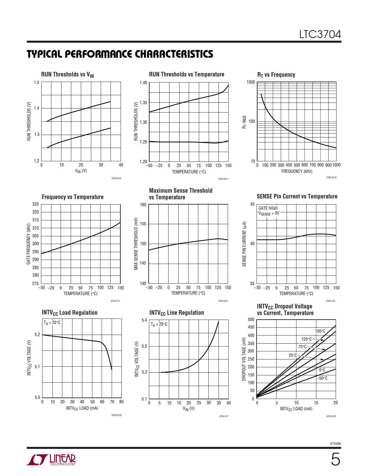 5.4 500 TA = 25°C TA = 25°C 450 150°C 5.2 400 125°C 350 5.3 75°C 300 25°C 250 VOLTAGE (V) VOLTAGE (V) CC 5.1 CC 200 0°C 5.2 INTV INTV 150 DROPOUT VOLTAGE (mV) –50°C 100 50 5.0 5.1 0 0 10 20 30 40 50 60 70 80 0 5 10 15 20 25 30 35 40 0 5 10 15 20 INTVCC LOAD (mA) VIN (V) INTVCC LOAD (mA) 3704 G16 3704 G17 3704 G18 3704fb 5